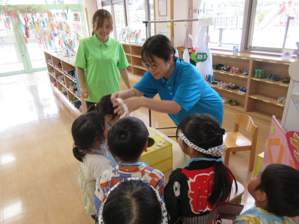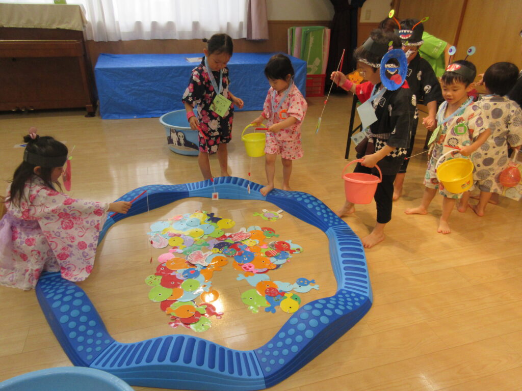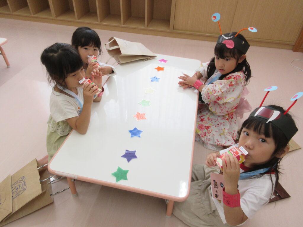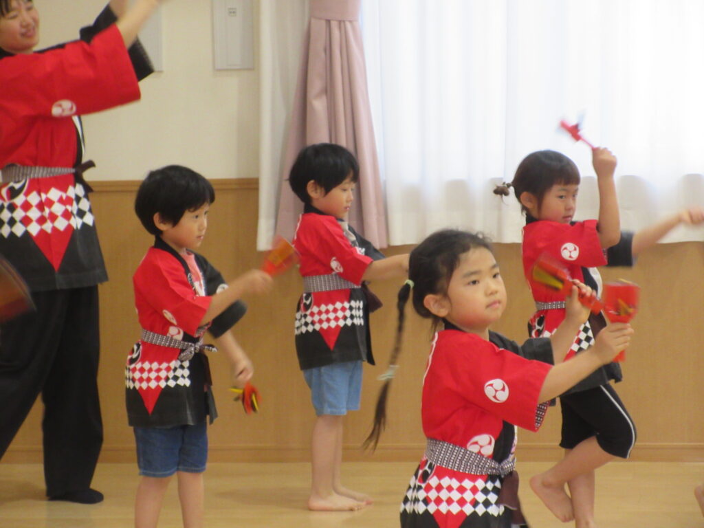 夏の一大イベントなつまつり!今年のテーマは「10周年だよ!~コスモスまつり~全員集合!!」。各コーナーコスモス(宇宙)にちなんだ装飾や内容で雰囲気が高まりました♪たいよう組さんのオープニング「爽涼鼓舞」でスタート!0・1・2歳児は先生たちと、3・4・5・歳児は異年齢でペアを組んでコーナーをまわりました☺️