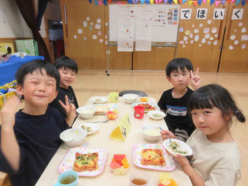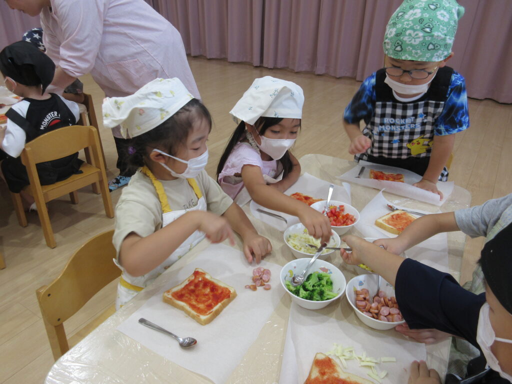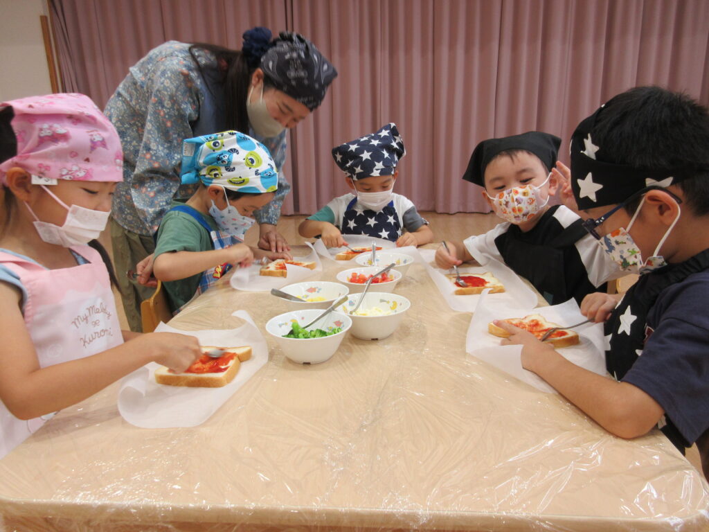 たいよう組だけの行事「おもいで保育」。ビー玉や輪ゴムで模様付けをしたTシャツ染め、映画鑑賞、夕食のピザ作りなどいろいろな経験ができました♪行事を通して一段と5歳児クラスとしての自信がついたようで、頼もしい姿がたくさん見られました✨
