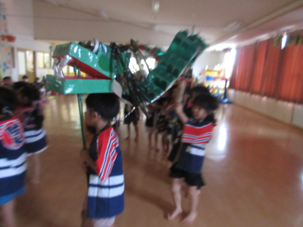 1つは、以前もご紹介したお神輿と一緒に練り歩く「たいようりゅう」(以前よりバージョンアップしています。何が足されたか分かるかな~)