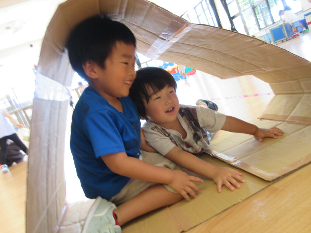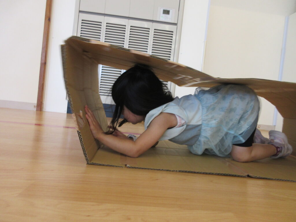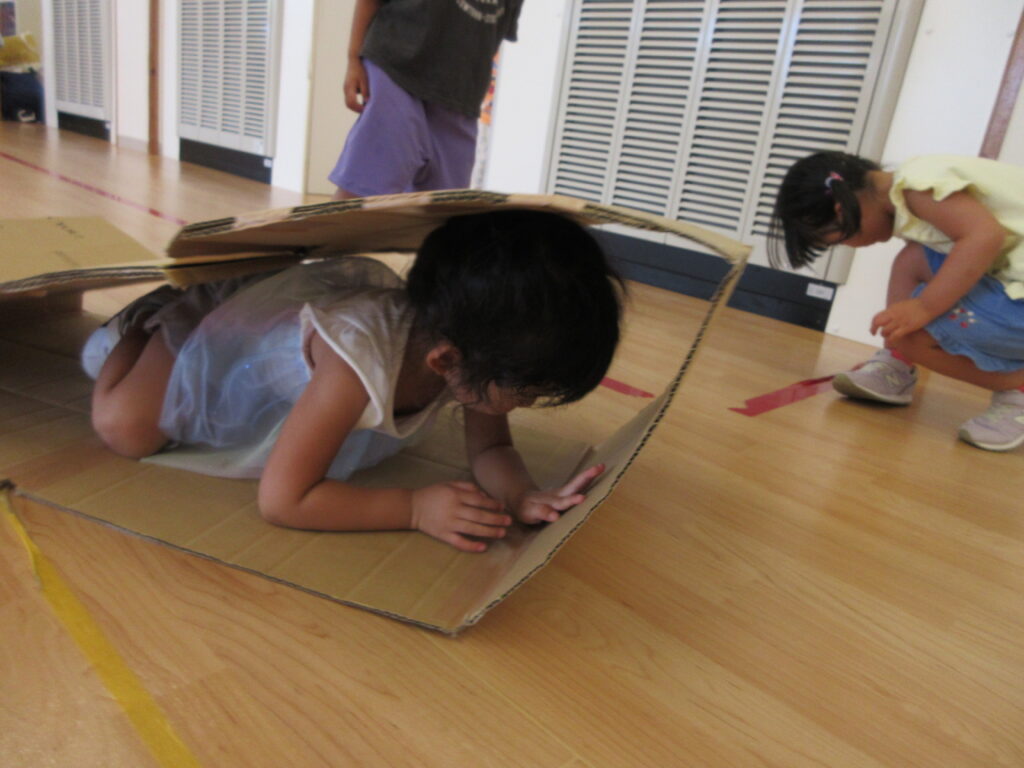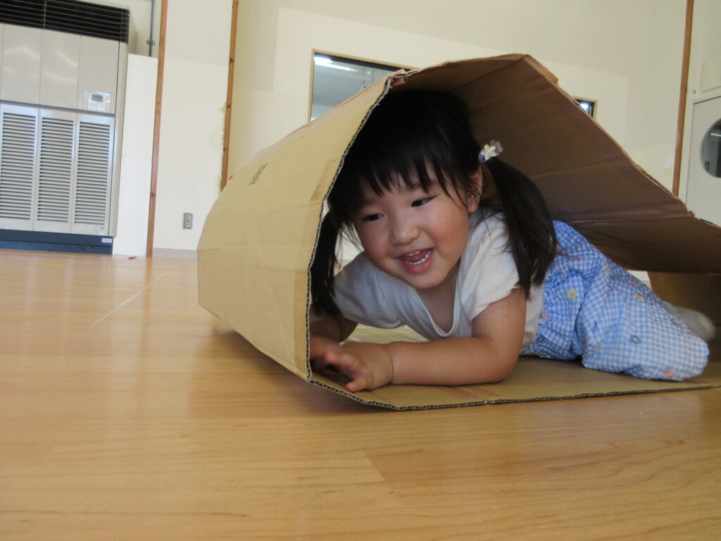 保育者がやり方を伝えると「やってみたい!」と言う子どもたち。ただ、ハイハイで進もうとしても、上の段ボールが頭や背中にくっついてしまうため、なかなか難しい様子。それでも、ゆっくりと少しずつ手を前に動かし、進んでいました。慣れてくると進むスピードが速くなり、中には2人で寝た体制で入り勢いよく転がって進む子もいました。真っ直ぐ前に進むこともできていて、楽しんでいる様子でした。