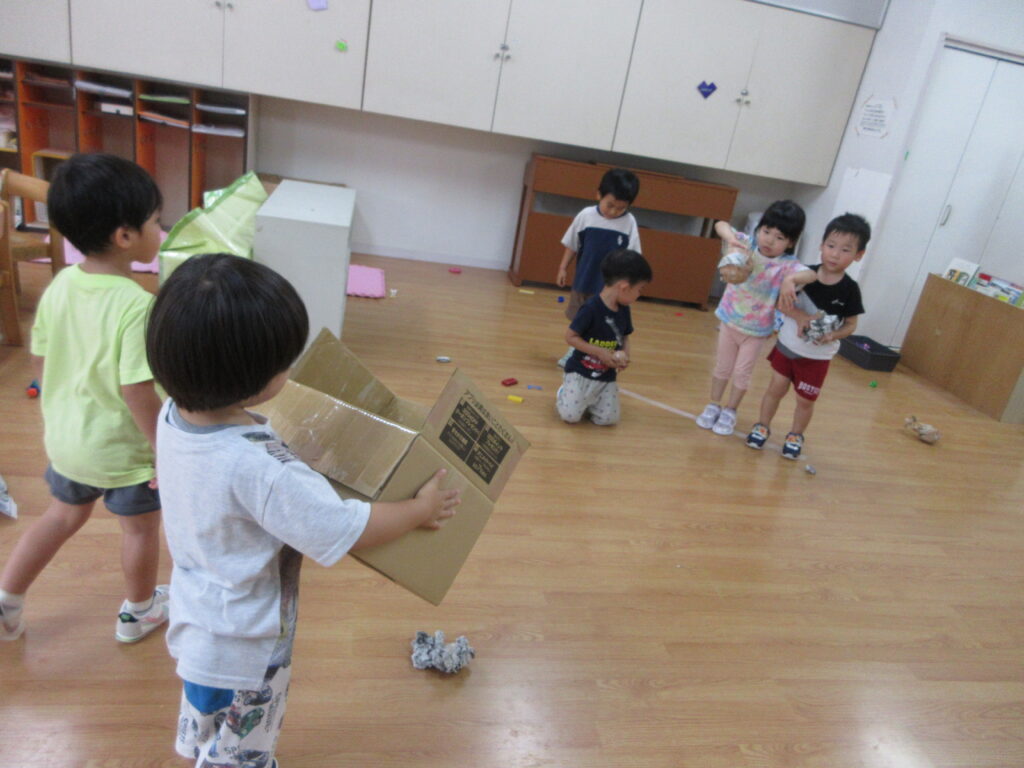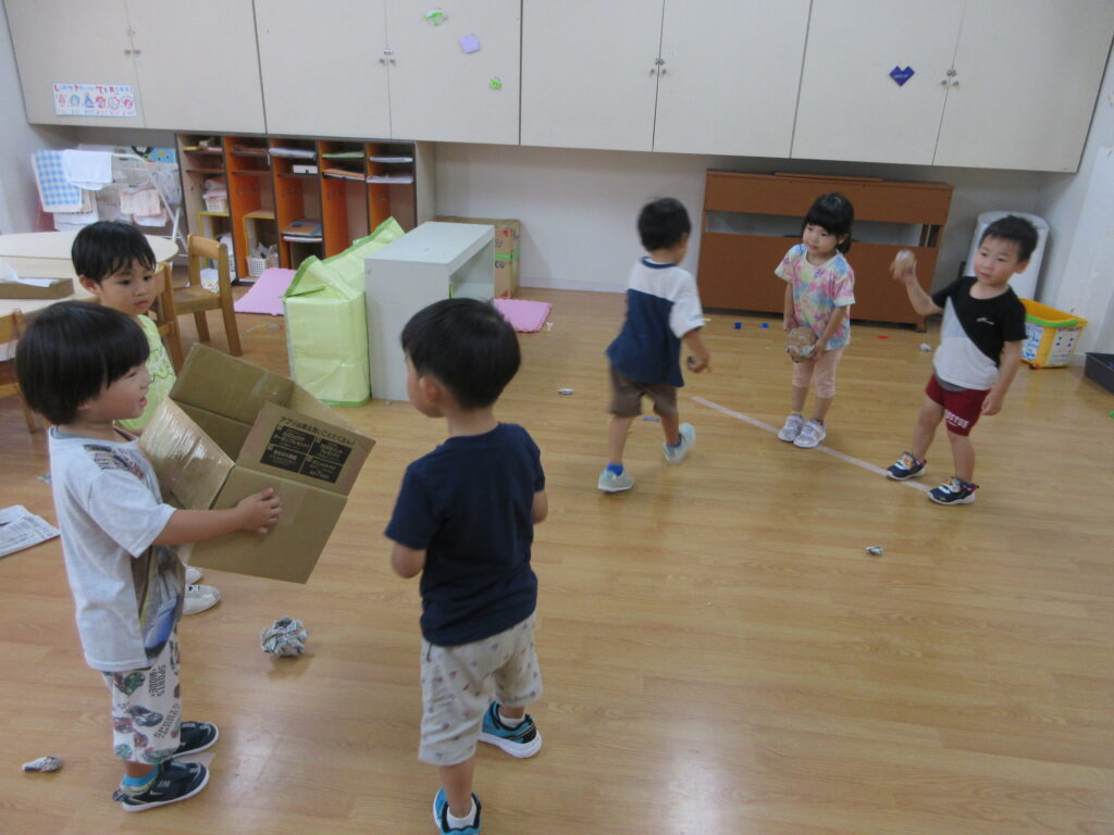 投げる場所と箱の場所が少し離れているため、投げてもなかなか入らず…。箱を持っている子が、段ボールの中にボールが入るたびに「ピンポン!」「はいった!」と言ってくれるので、それが投げる子たちのやる気にも繋がっているようでした。