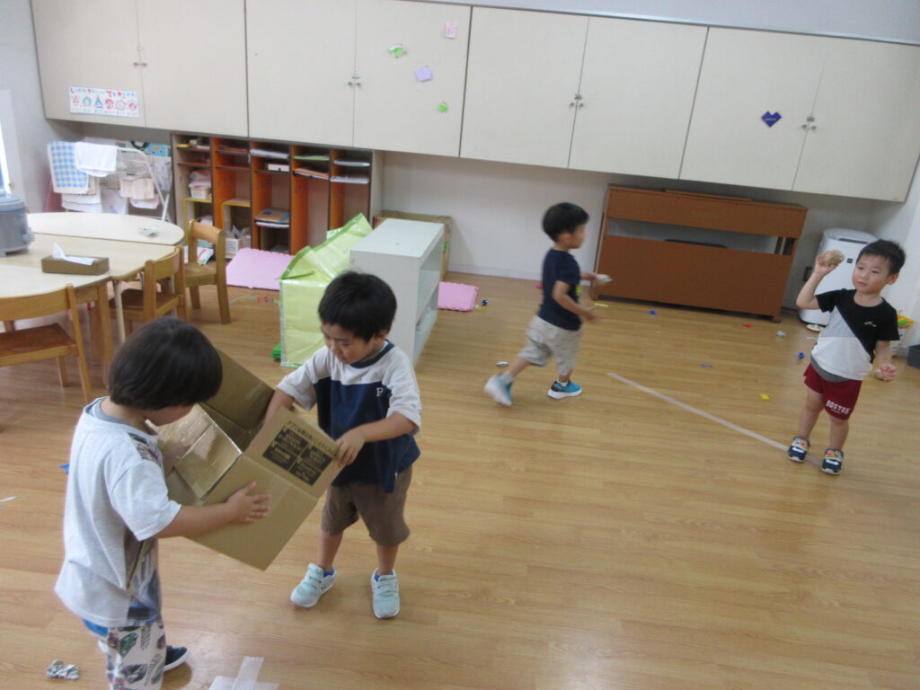 お部屋に段ボールを用意すると、子どもたちは太鼓のように叩いたり箱型にした中にお風呂と見立てて入ったりと、工夫して遊んでいます。