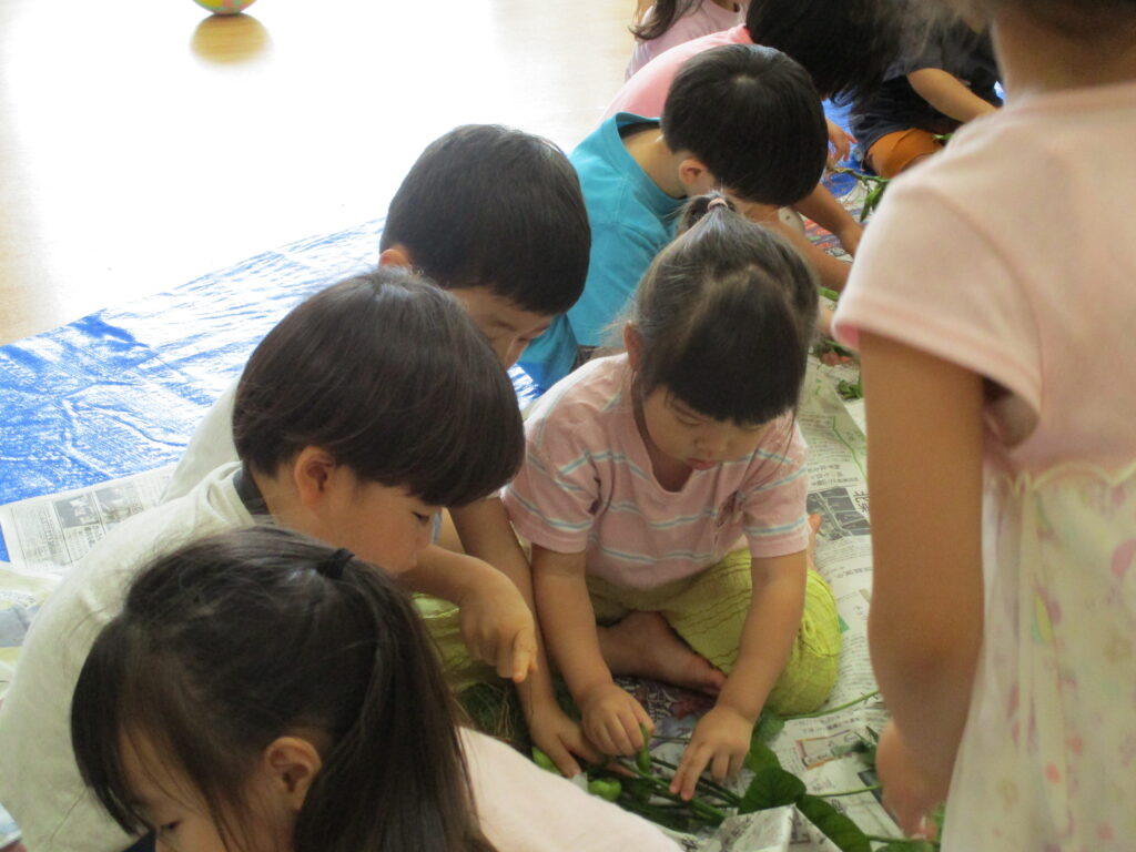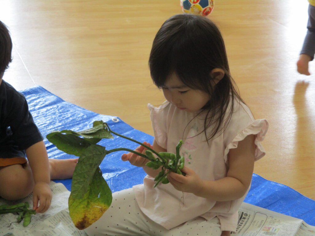 葉っぱや枝豆に興味津々の子どもたち。