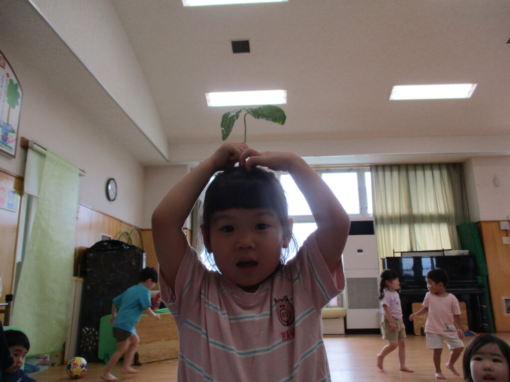 枝豆を全部取ったあと、葉っぱと枝を見つけ「傘みたい!」「ピクミンみたい」と傘やピクミンに見立てて頭の上へ。とても可愛かったです💓