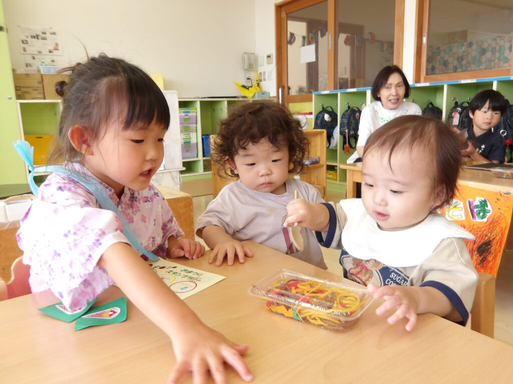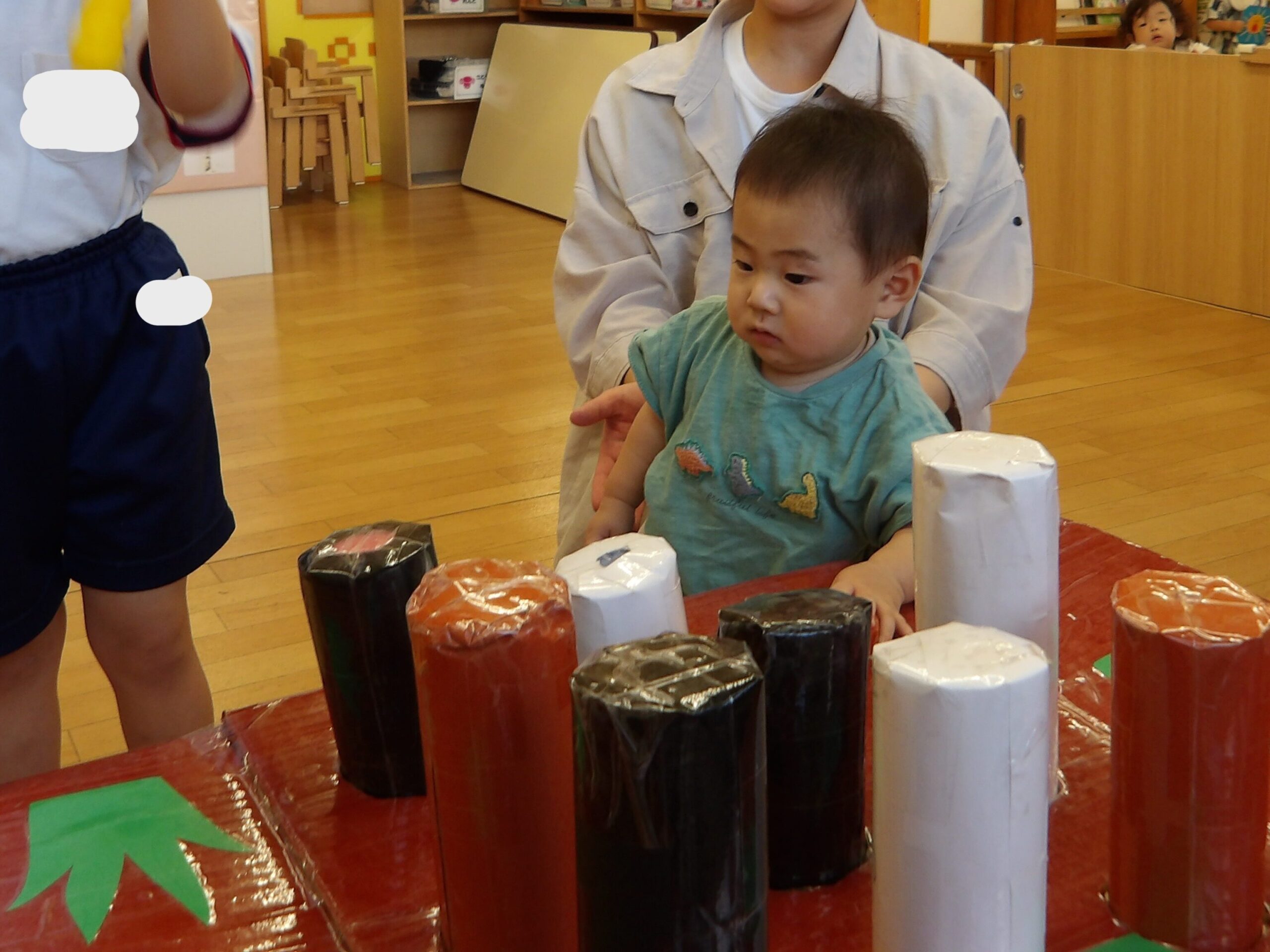 1日目の夕方に、0,1,2歳児さんの親子ゲームがありました。もぐらたたきはなんだかドキドキ…優しくトントン叩くお友だちがいたり、思いきり力強く叩くお友だちがいたり…親子や兄弟で一緒に楽しい時間になりましたね☺