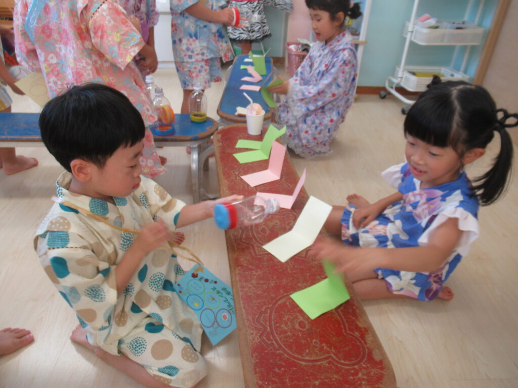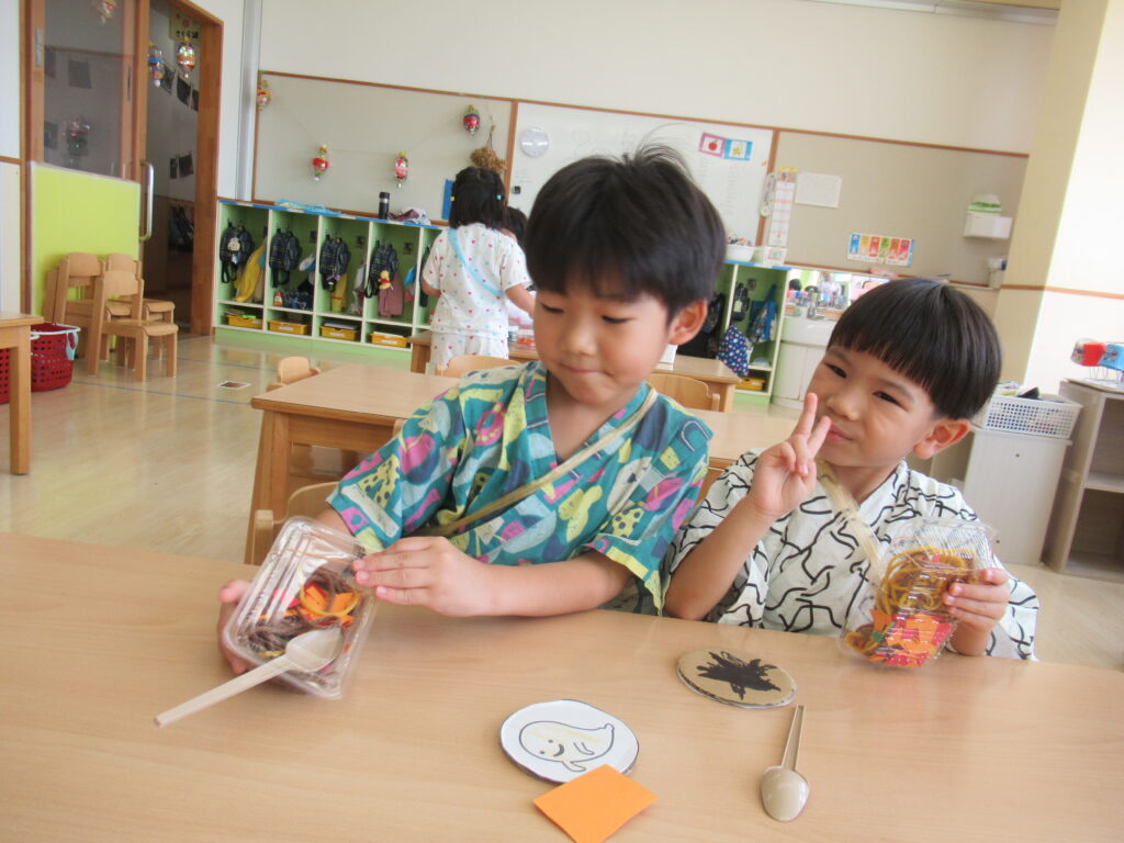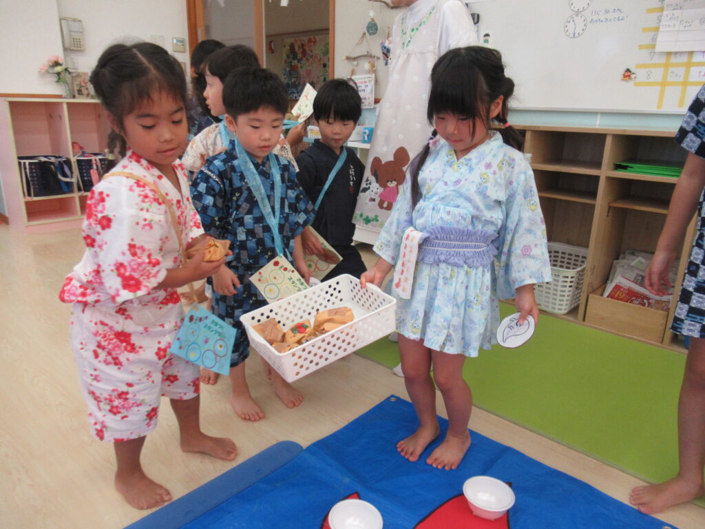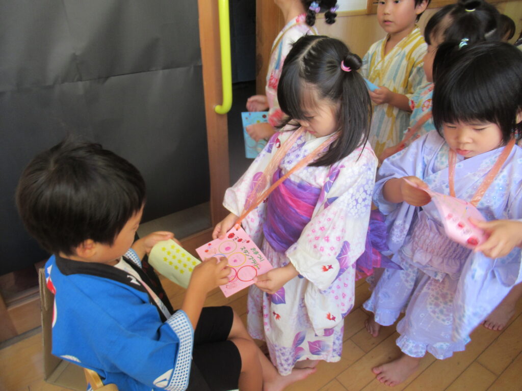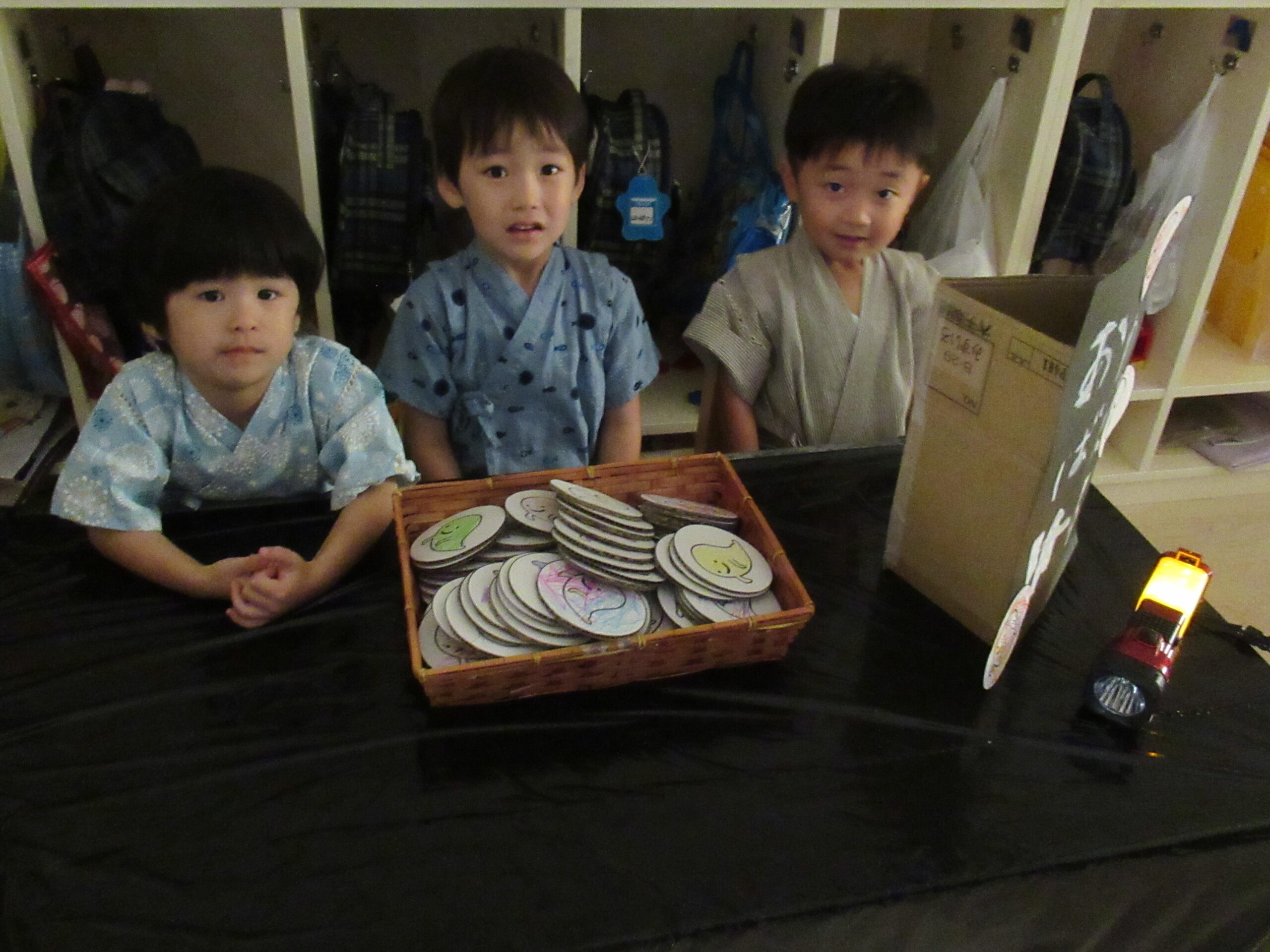 ゆり組では、「しゃてき屋さん」「たこやきDe的当て屋さん」が出店していました。ゆり組の子どもたちが、ルール説明をしたりシールを貼ってあげたり、並ぶ列の整備をしてくれていたりと大忙しでした。