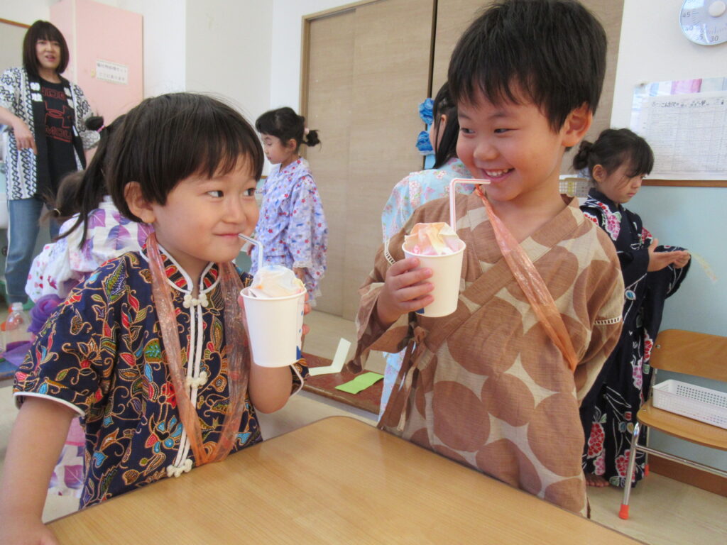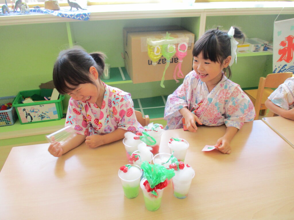 しゃてき屋さんでは、的を狙ってペットボトルの空気砲を打つと「はずれ」「あたり」が出てきて、「あたり」が出るとなんとかき氷をもらえてその場で食べられるんですよ♪今日は久しぶりに暑い日になり、一段と美味しそうでした☺