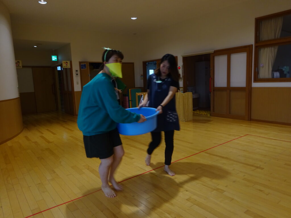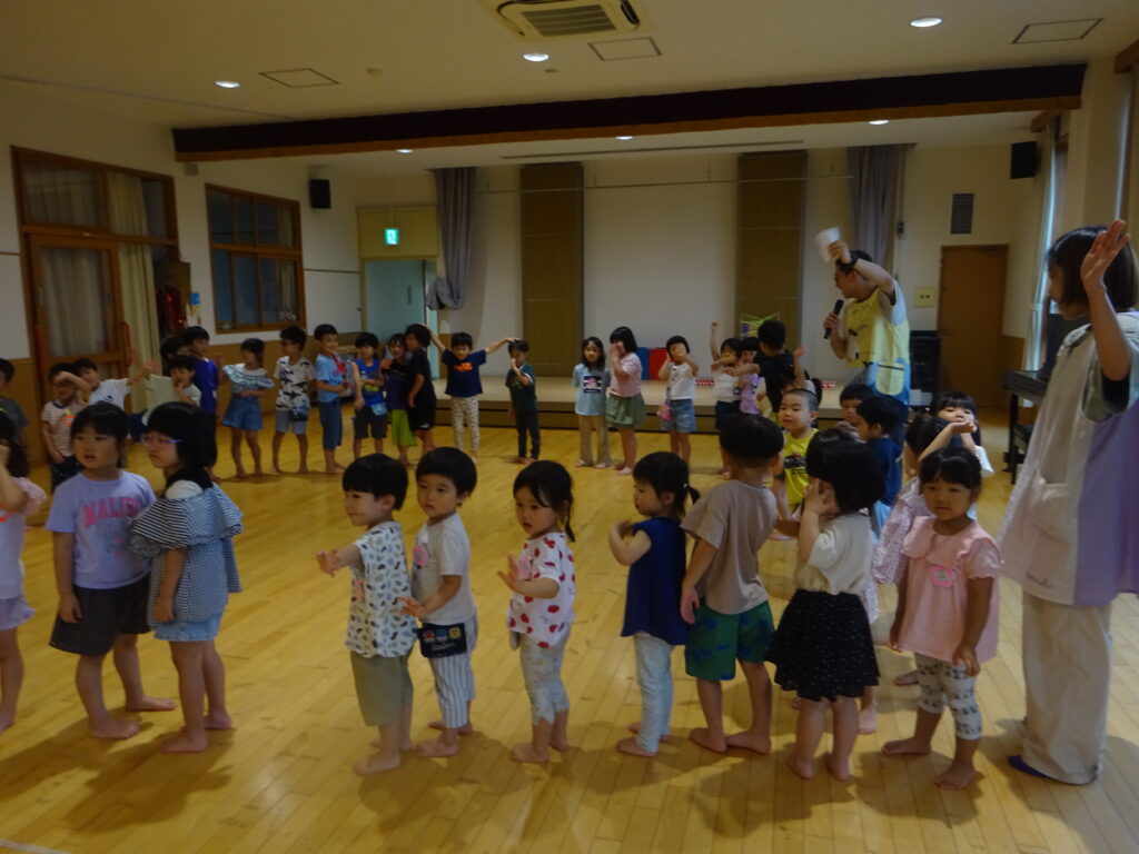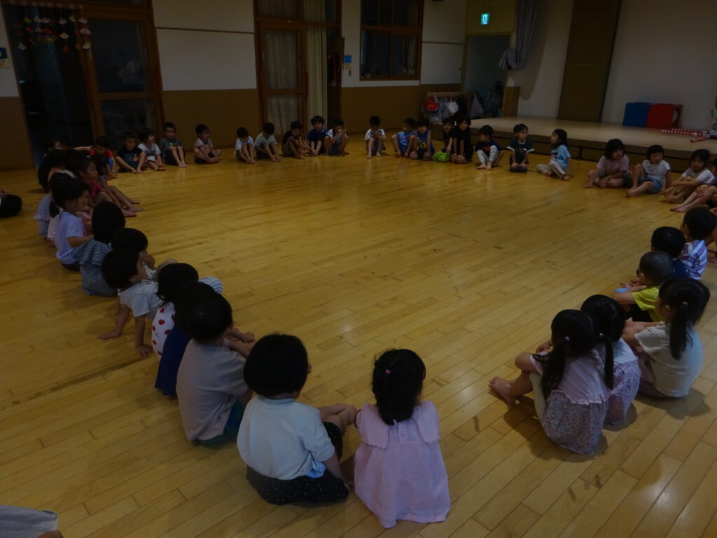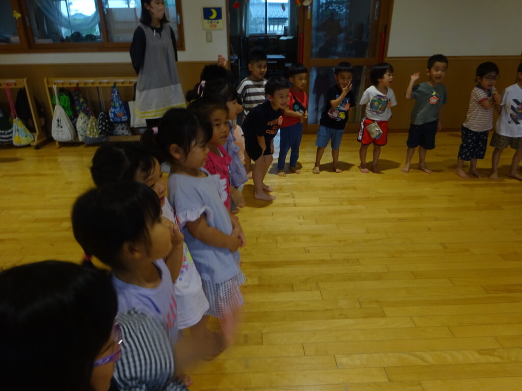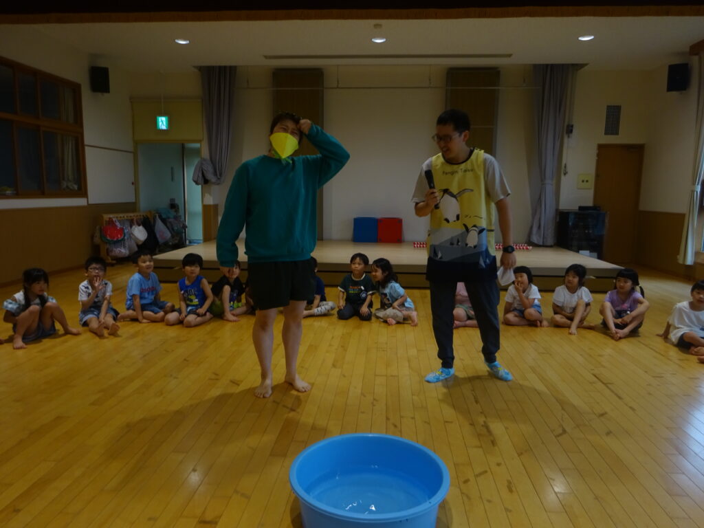 この日は悪天候で屋上へは行けなかったため、かっぱの神様の魔法の力でプールを小さくして持って来てくれました!沢山遊ばせてくれたプールにみんなでお礼を言い、また来年遊ぼうねと約束をしましたよ。