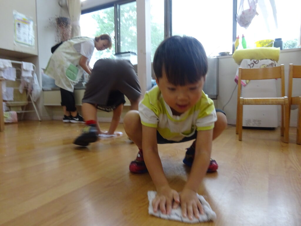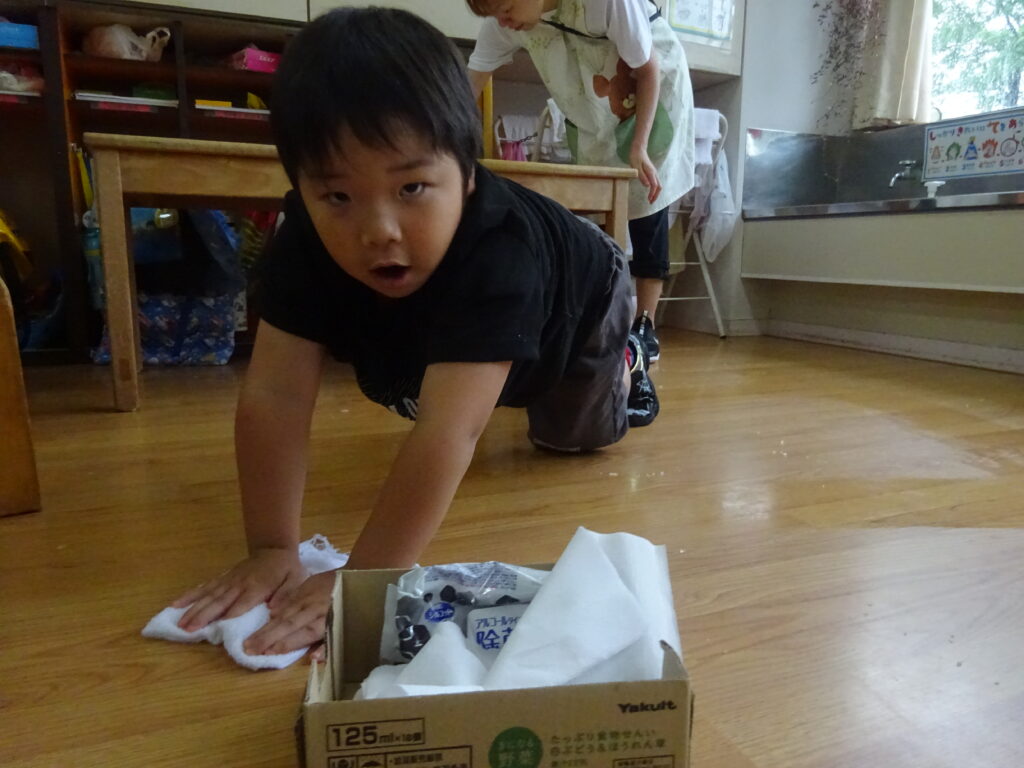 スライム遊びを存分に楽しんだ後は、落ちたスライムを拾って床を拭きました。「こっち拭いたからあっちおねがい」など声をかけ合う姿がさすが年長さんだなと思いました🌟最後にクイズの正解は「トマトをのせたハンバーガー」でした!