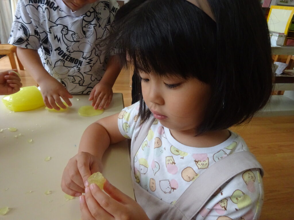 またスライムを外へ向けると「うわ!もっと透明になっちゃった」「でもテーブルに置くとすっごい黄色になる!色が濃いよ!」と気づいたことをどんどん言葉にしていました。外へ向ける発想は思い浮かばなかったので、子どもたちの遊びを見守っていると様々な発見があり、とても面白いですね。