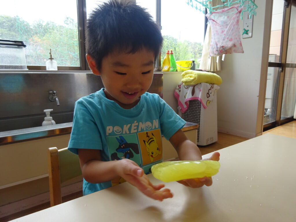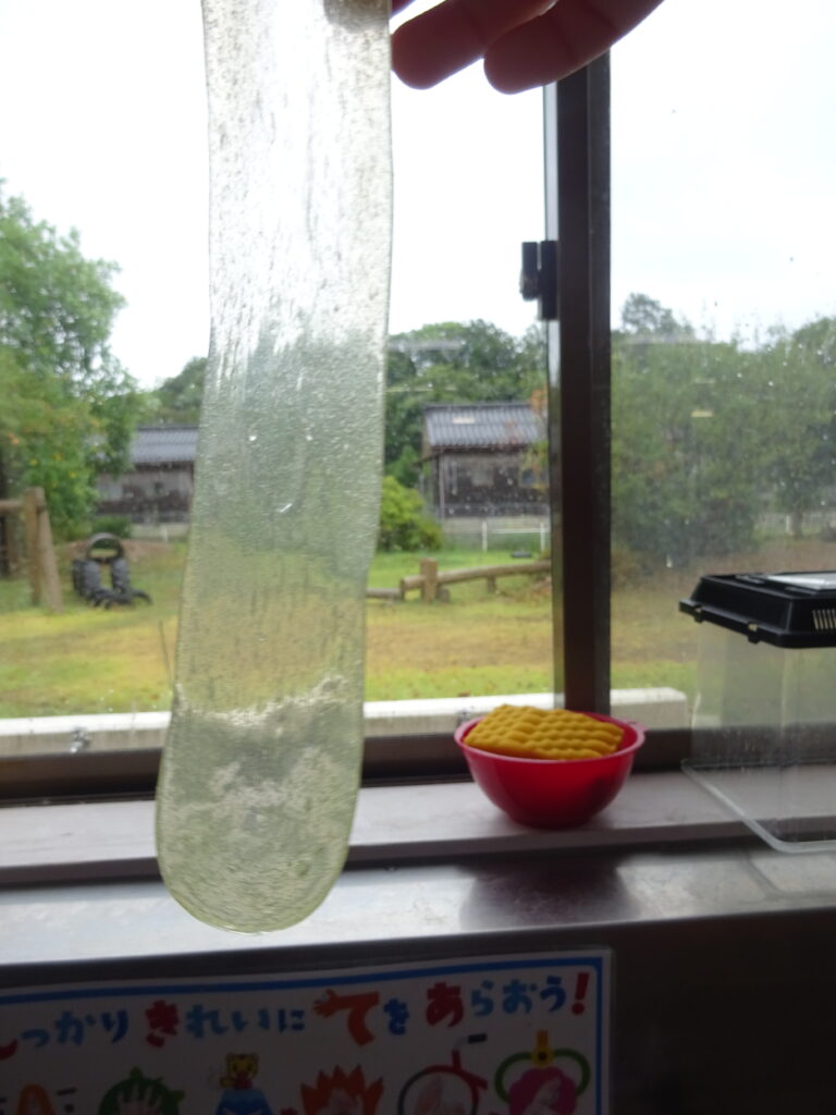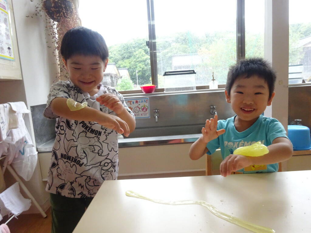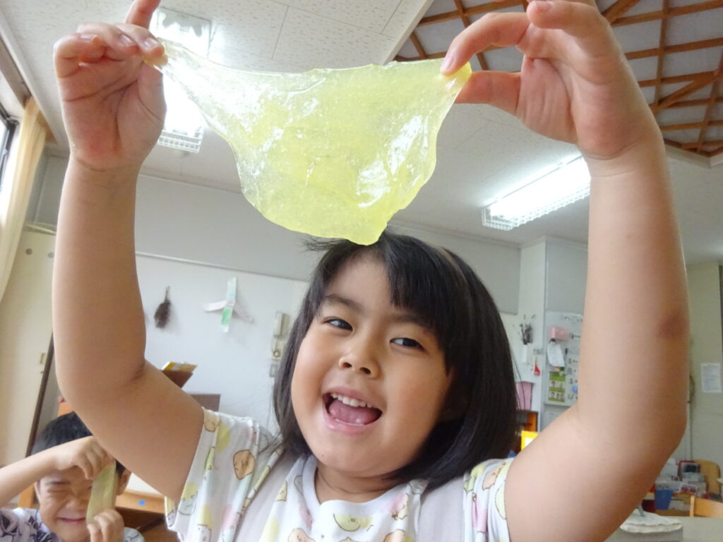またスライムを伸ばすと「透明になった」「え!ガラスみたいじゃない?」と大盛り上がりの子どもたち。なかにはスライムがすぐちぎれてしまい「うまくできない…」と呟いていましたが、子どもたち同士で「スライムはゆっくり伸ばせばいいんだよ」と教えていました。「たしかにゆっくりするとちぎれない!ありがとう」と感謝を伝える姿に素敵な関係ができているのだなとほっこりしました。
