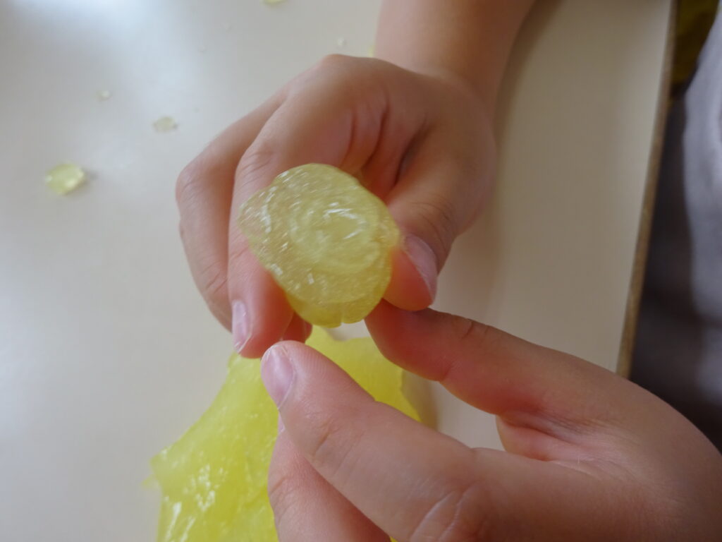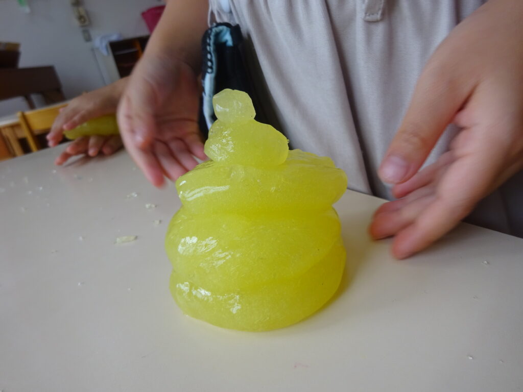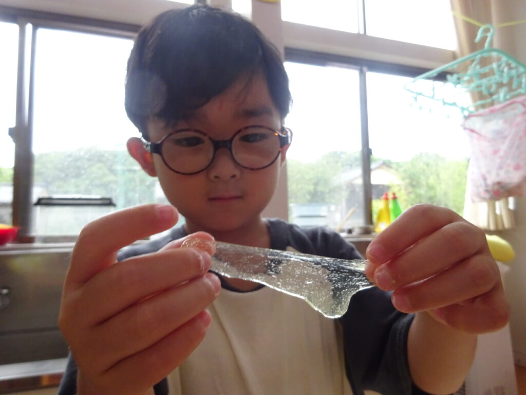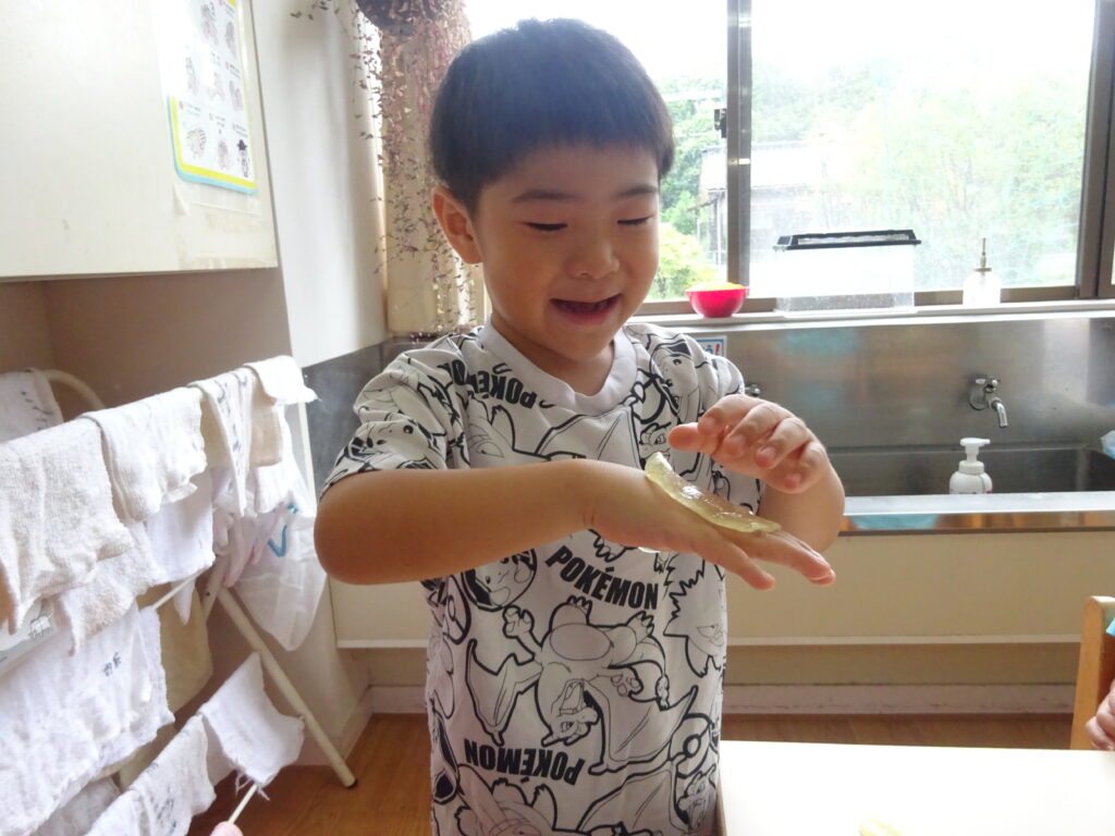 またスライムを伸ばすと「透明になった」「え!ガラスみたいじゃない?」と大盛り上がりの子どもたち。なかにはスライムがすぐちぎれてしまい「うまくできない…」と呟いていましたが、子どもたち同士で「スライムはゆっくり伸ばせばいいんだよ」と教えていました。「たしかにゆっくりするとちぎれない!ありがとう」と感謝を伝える姿に素敵な関係ができているのだなとほっこりしました。