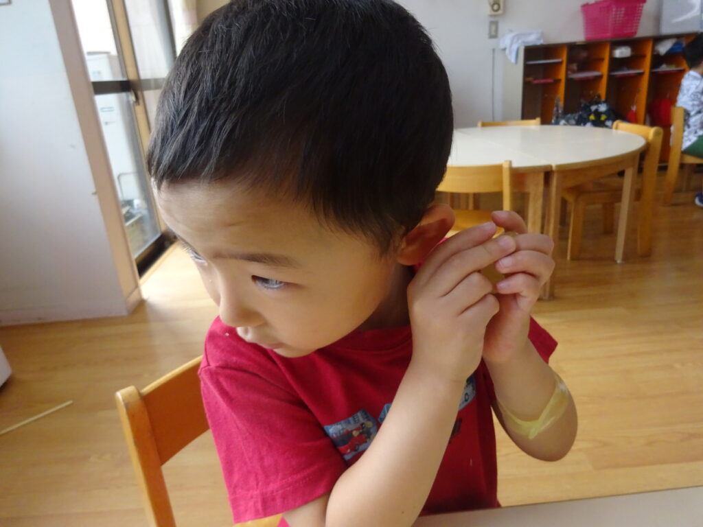 伸ばしたスライムを腕にのせると「つめたい!」「冷えピタみたいじゃない?」と笑い合っていました。「これから熱が出たときはスライムを作っておでこに貼ればいいね」とクスクス笑っていました😊