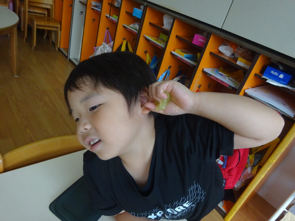 またスライムを耳元に近づけて「こうやると良い音がする…」と話し、手のひらで力強くギュッと押す音、指で潰す音など聞こえ方が違うようで、その音の変化を楽しんでいました。