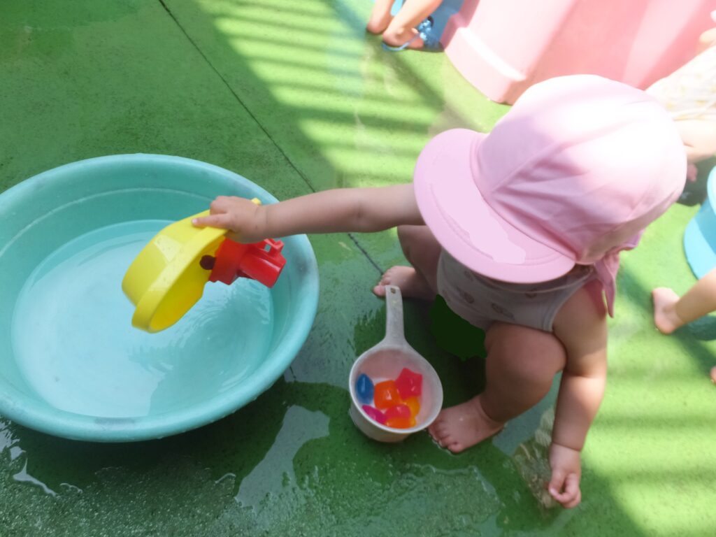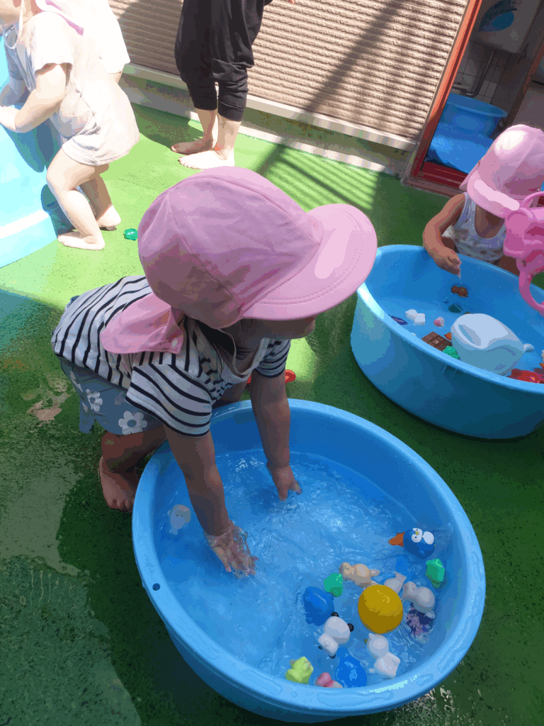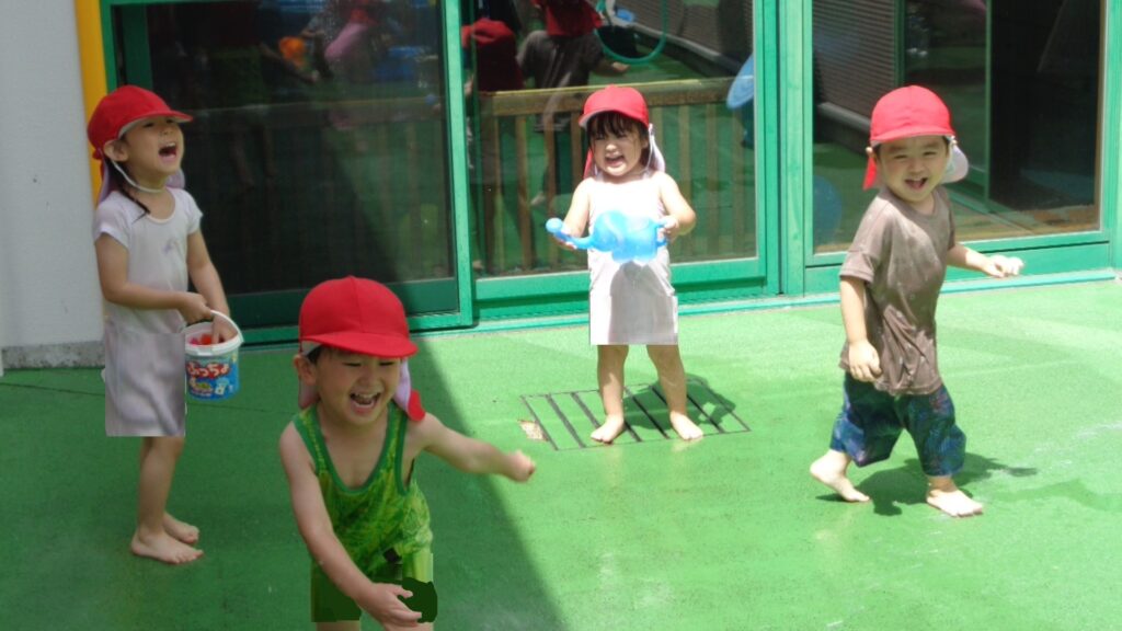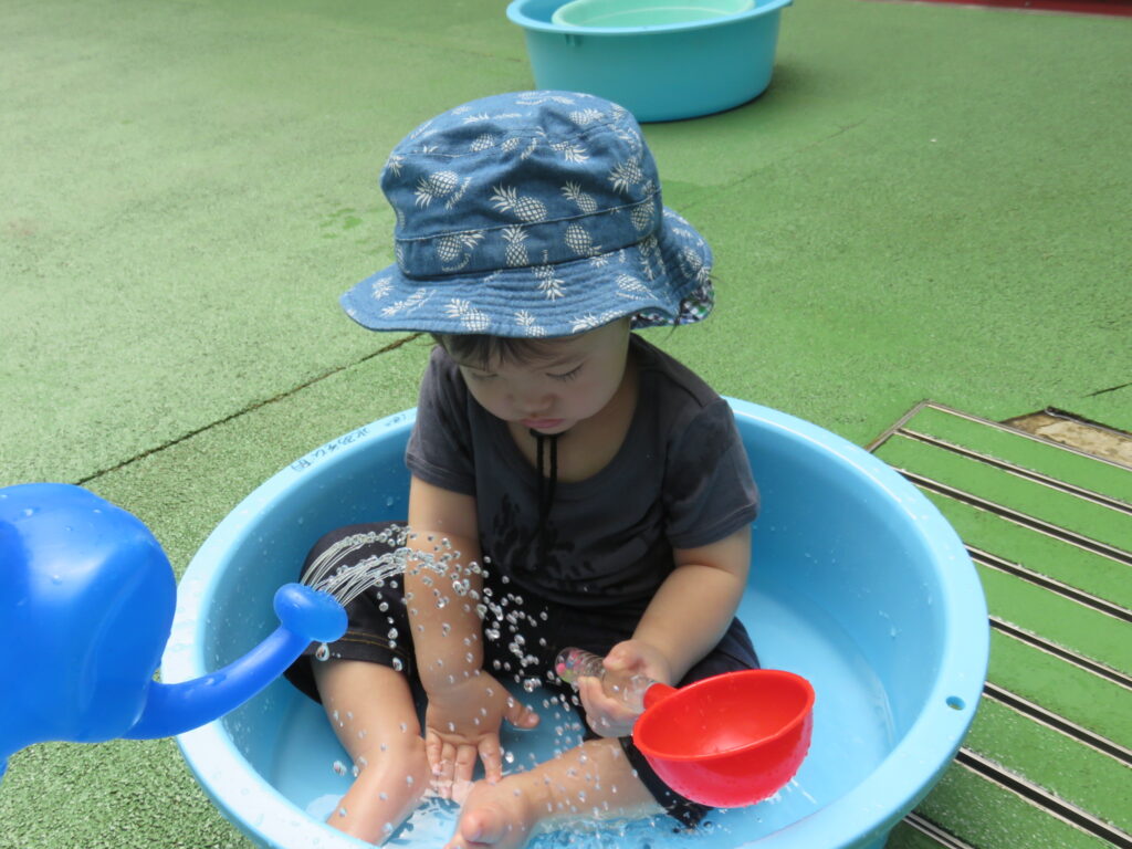 お友達に水をかけてもらい「冷たーい!」と嬉しそう!