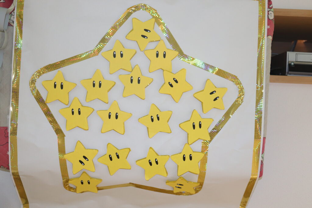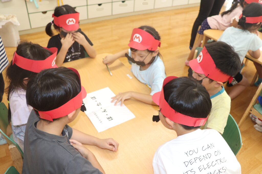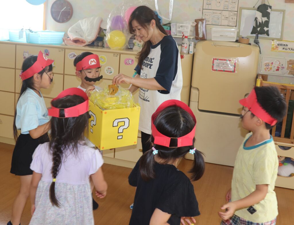 なんとひまわり組にクッパから手紙が届き…ピーチ姫を助けることになった子ども達は、難しい謎解きに挑戦することに!みんなで協力してスターを集め無事にピーチ姫を助けお宝をゲットする事ができました!!お楽しみ会を経てまたひとつ団結力が固まったひまわり組さんでした♪