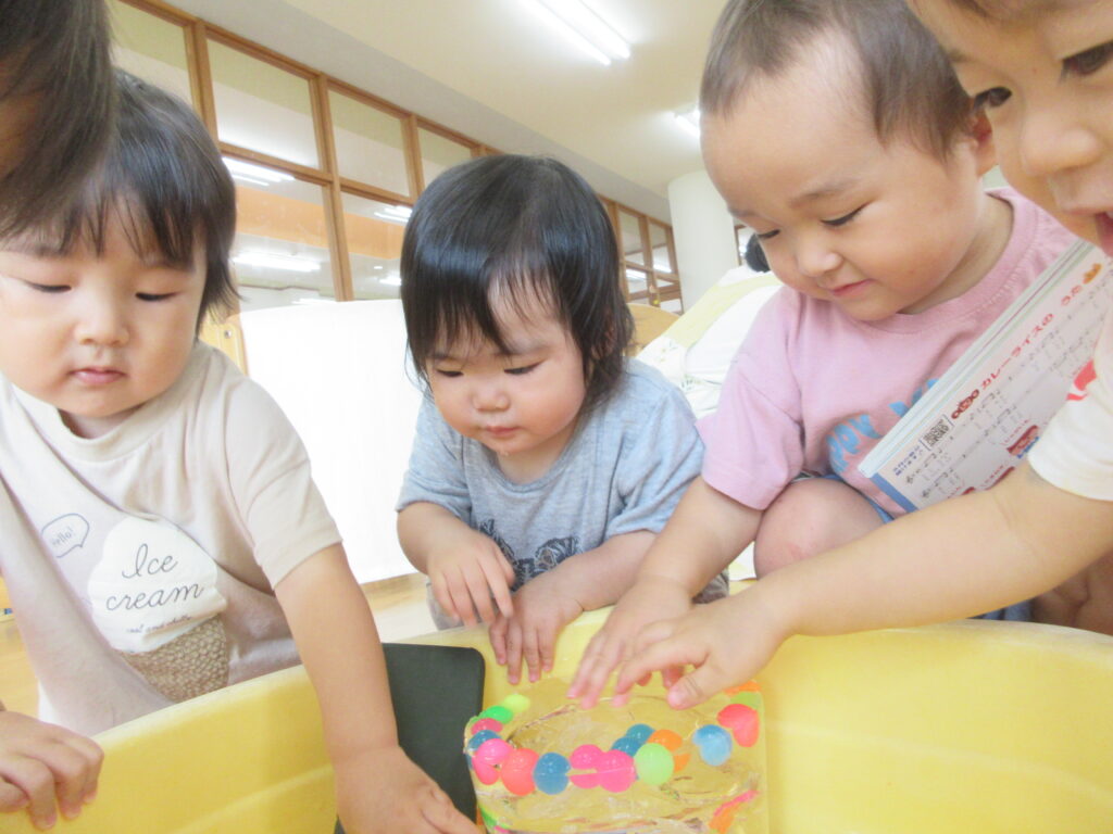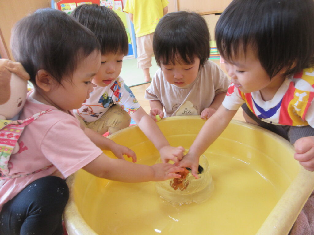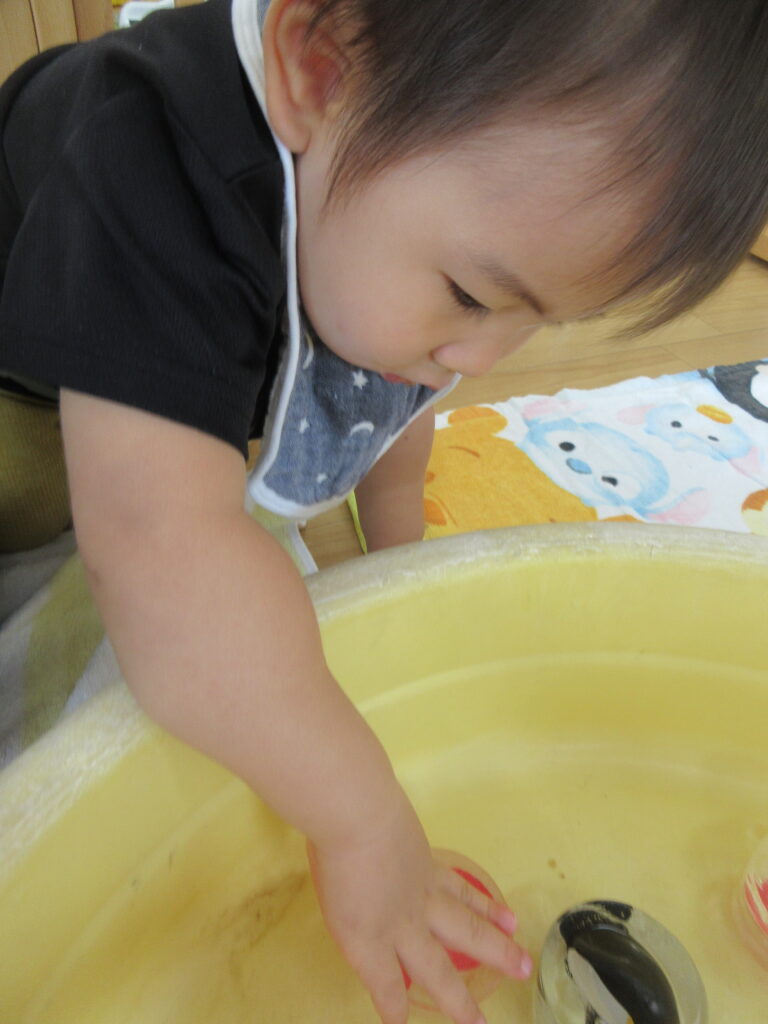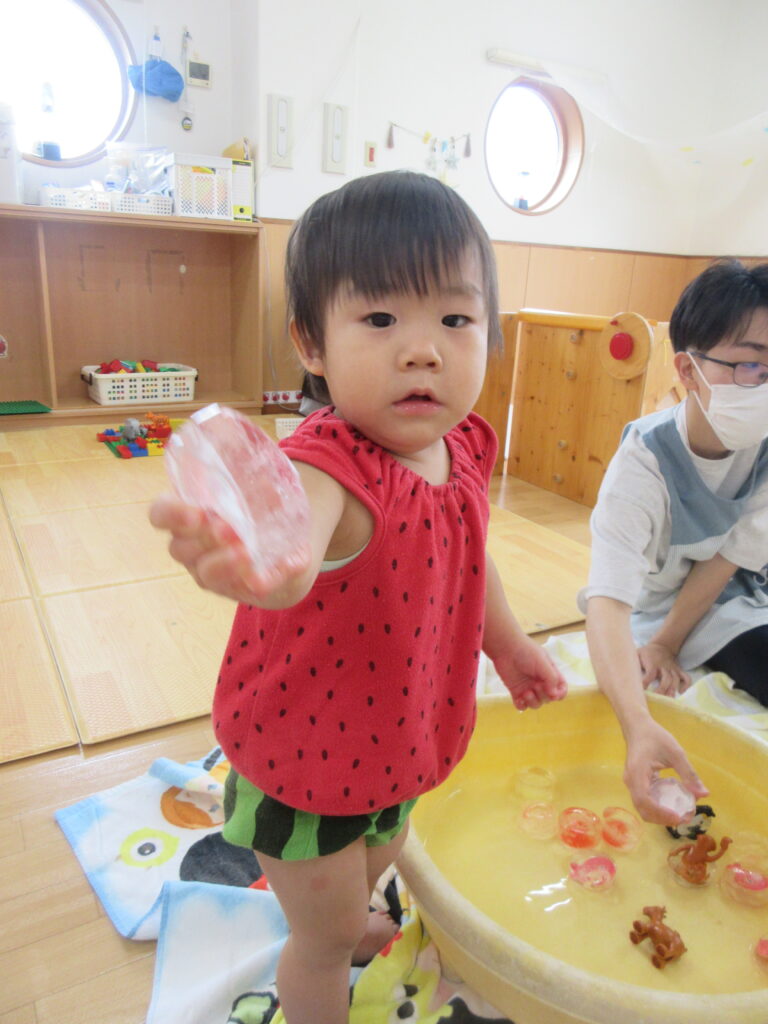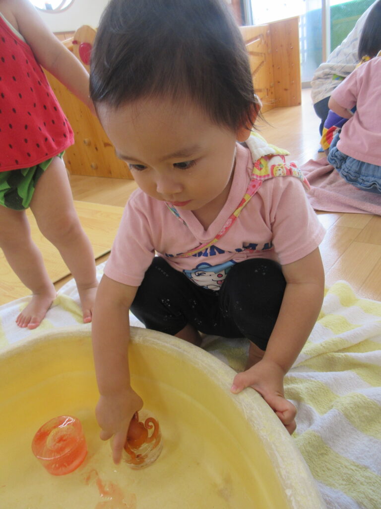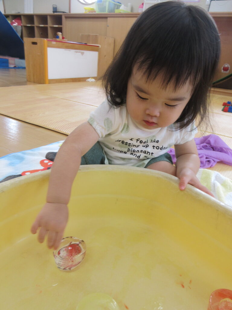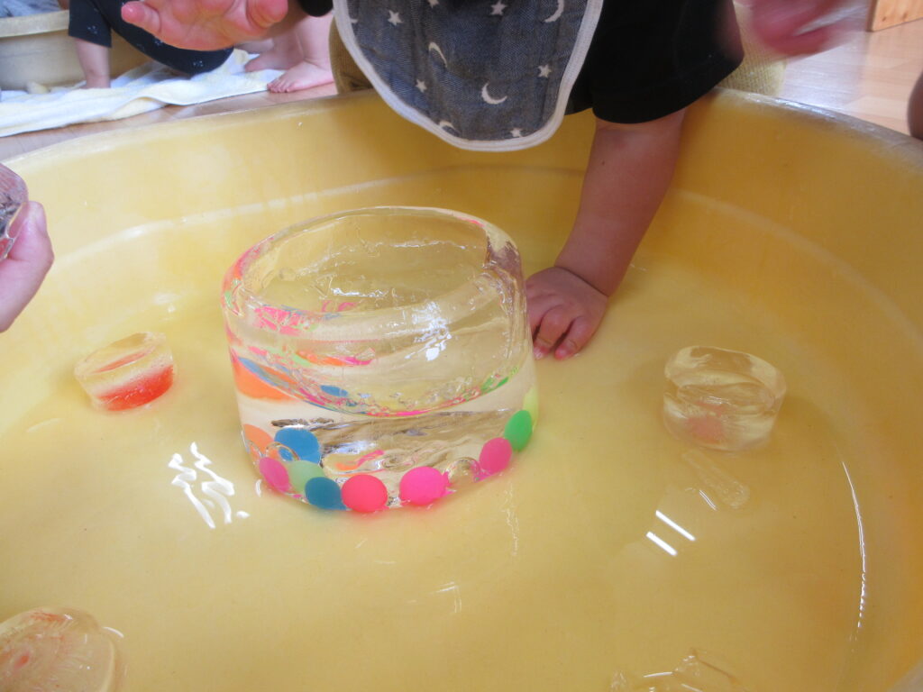 先日の感触遊びを楽しむ姿から今日は氷遊びを楽しみました。