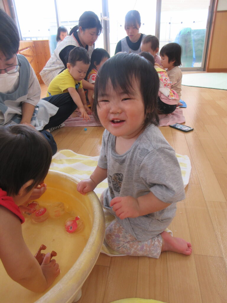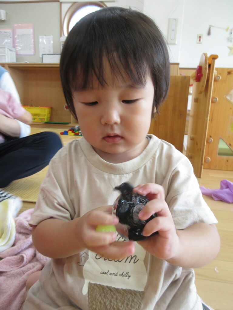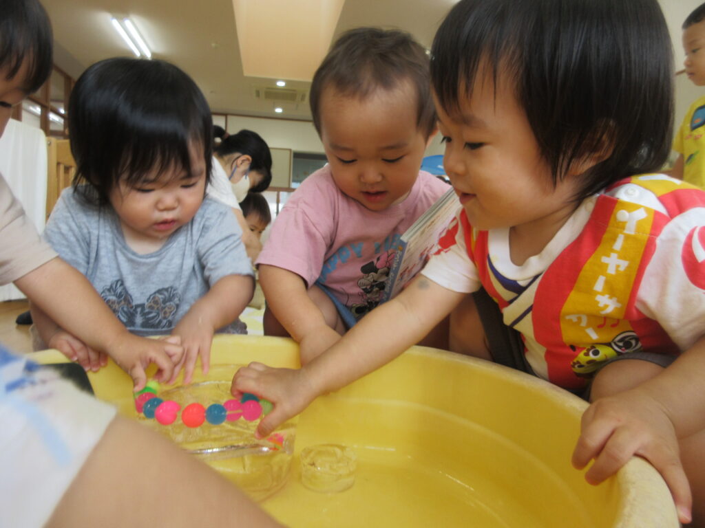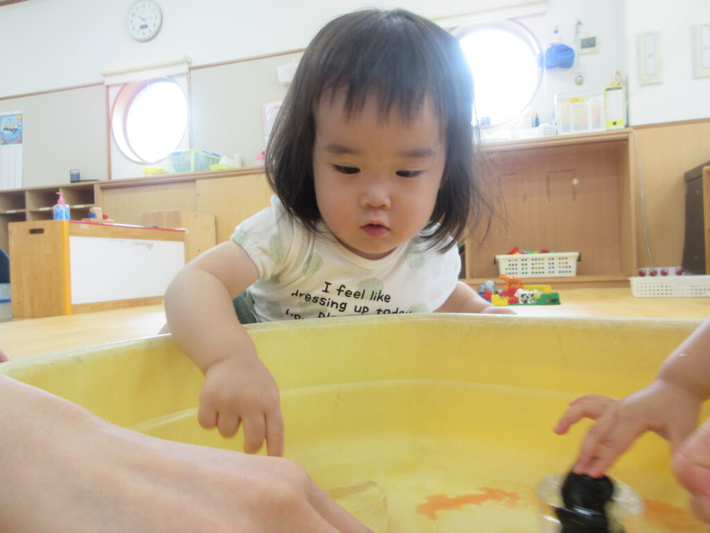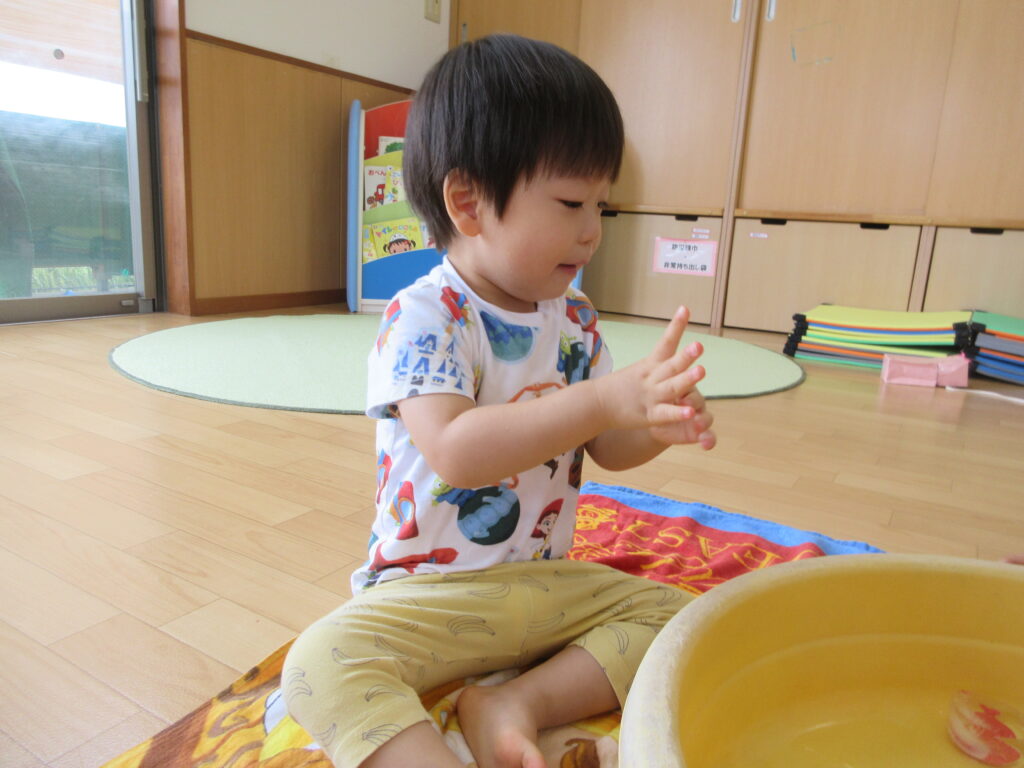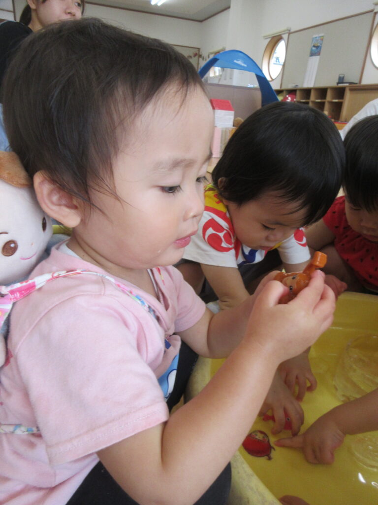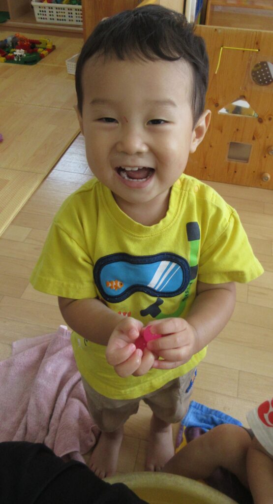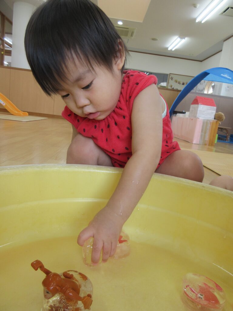先日の感触遊びを楽しむ姿から今日は氷遊びを楽しみました。