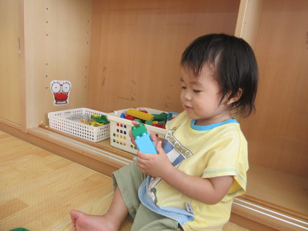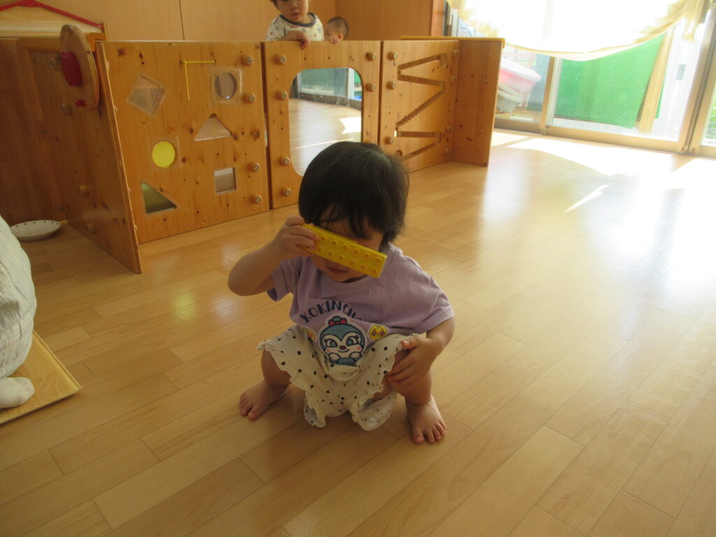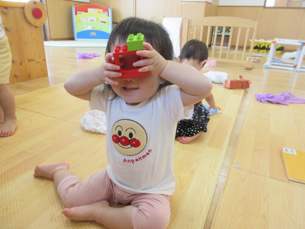 最近お部屋にブロックのおもちゃを出したので、そんな子どもたちの姿から保育者がカメラを作って「カシャ」と撮ってみせると「かしてかして~」とブロックのカメラで写真を撮っていました!