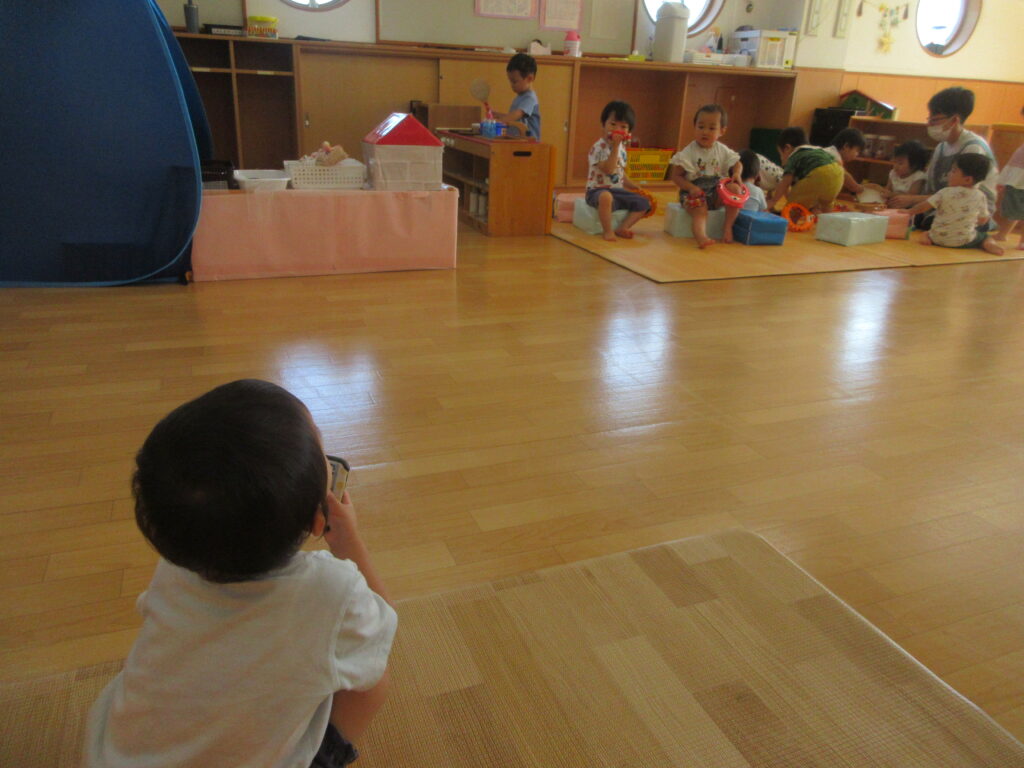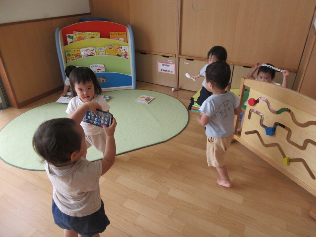 みんなが楽しそうに遊んでいる姿を見て「は~いみんな見て~写真とるよ~カシャカシャ」とカメラマンになりきって写真を撮るお友だちも😊