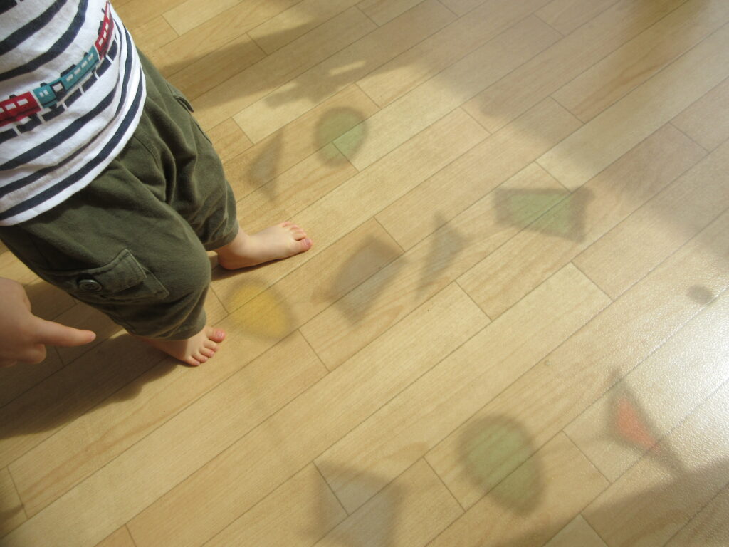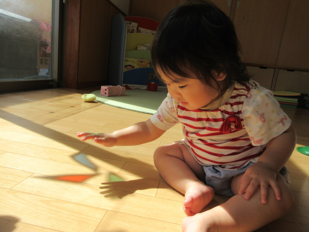 お部屋におひさまの光が差した日は、カラーセロハンを使って遊びました!こんな風に色々な形・色のカラーセロハンを窓際に吊るしておくと…