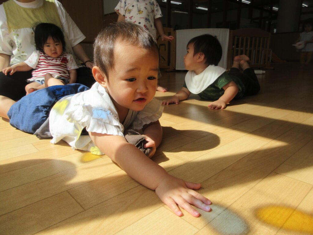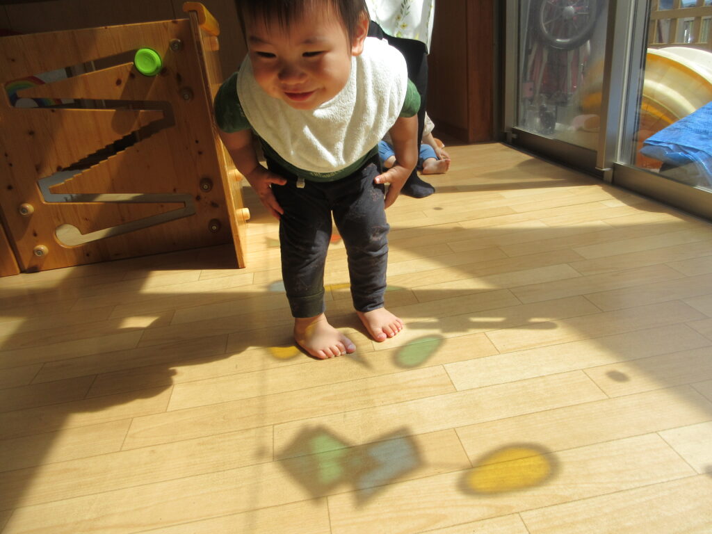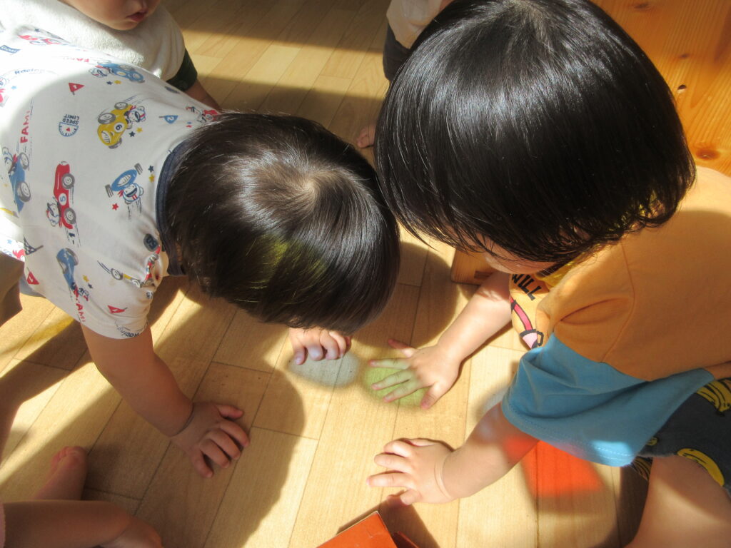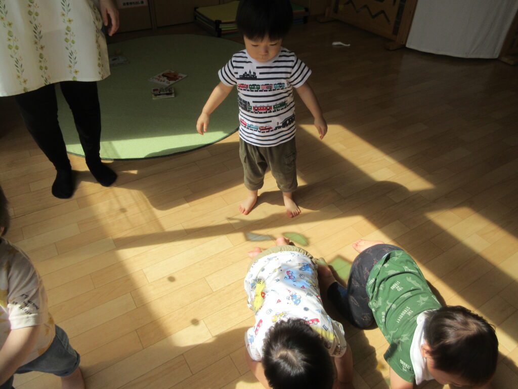 しばらくするとおひさまが雲に隠れて影が消えてしまいました。消えるという発見をして「ない!!」と驚くお友だちもいれば、さっきまで見ていた影はどこにいったんだ…「ないよ…」としょんぼりするお友だちも。そこで「おーーーい!!」と呼んで待ってみると、
