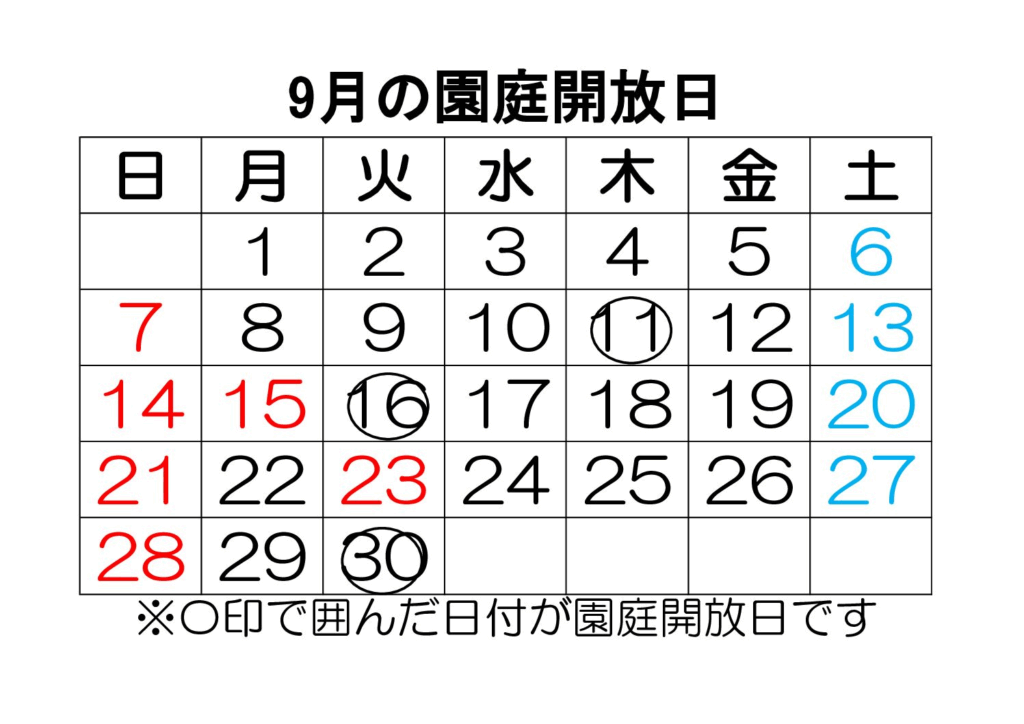9月の園庭開放日は下記のカレンダーの通りです。なお、雨天時や園庭コンディションが悪い日、暑さ指数が厳重警戒以上の場合には園庭開放を中止させていただきます。また、運動会の練習のため、園児が園庭を使用している場合もあります。ご了承ください。