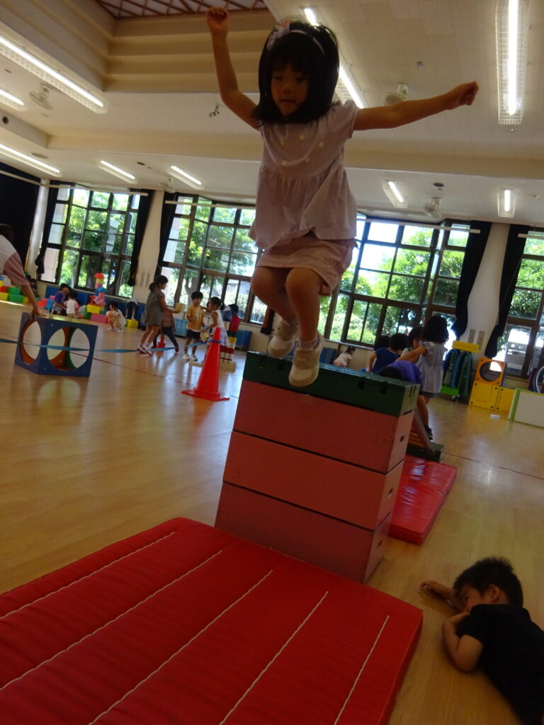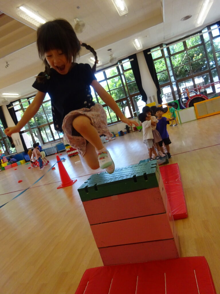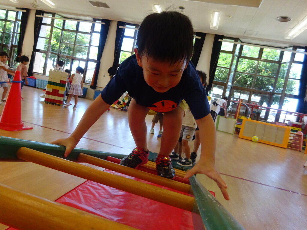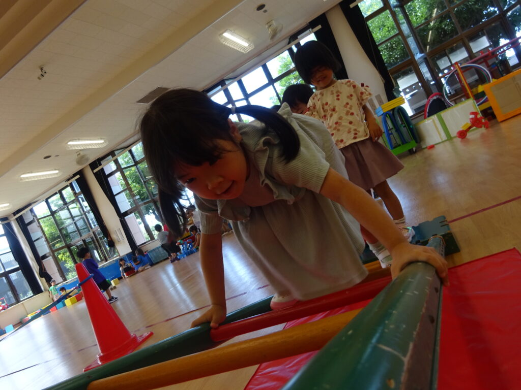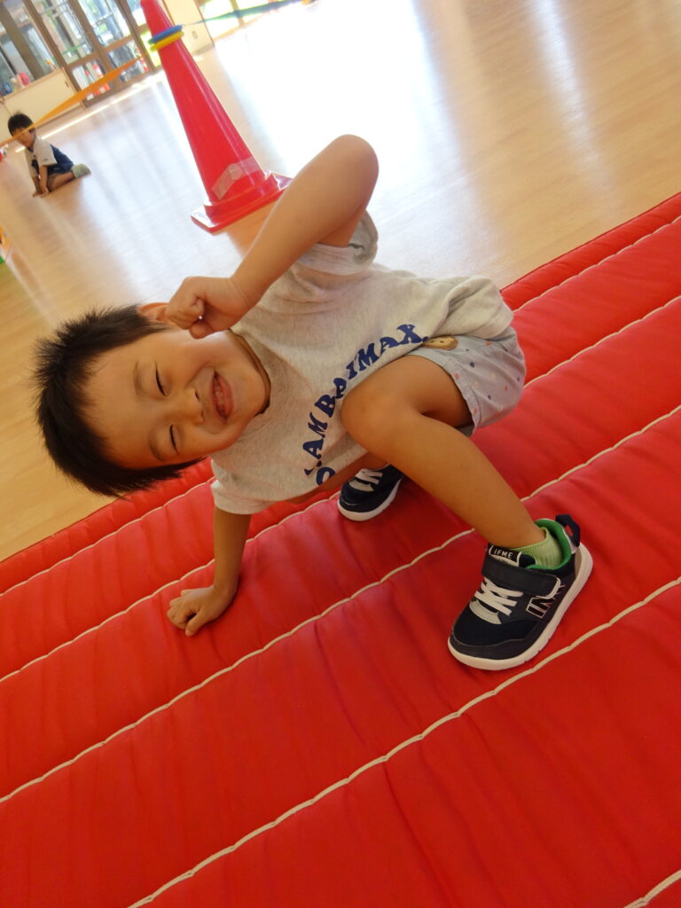 完成すると❝私が❞ ❝僕が❞とやる気満々!斜めに設置している為怖さからゆっくり進んでいく子ども、❝簡単、簡単❞と少しスピードアップして進んでいく子どもと様々な姿が見られました。また登り切った後はマットをめがけて思いっきりジャンプすることを楽しんでいました☺