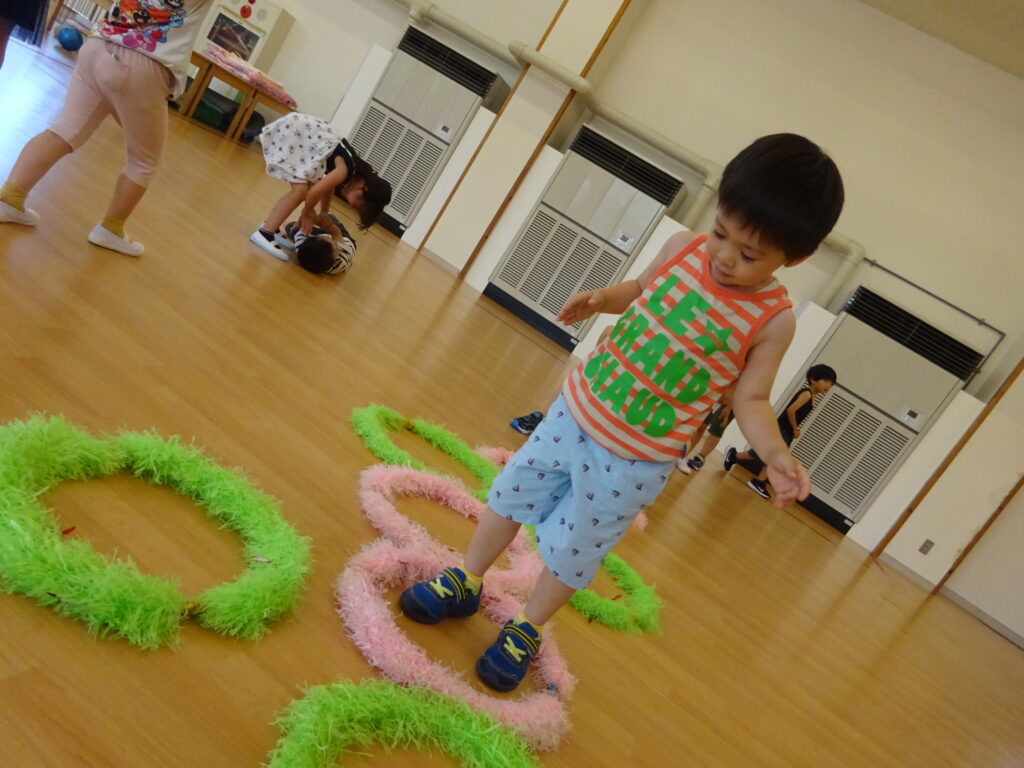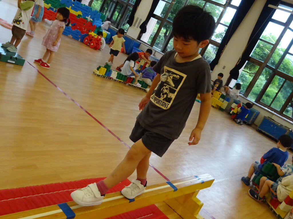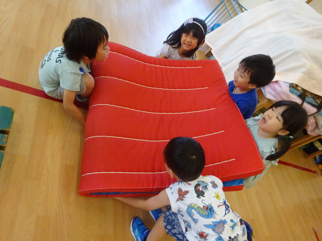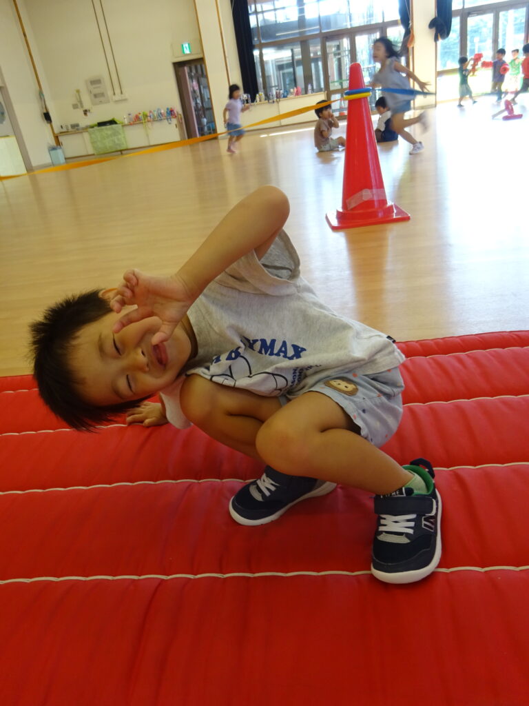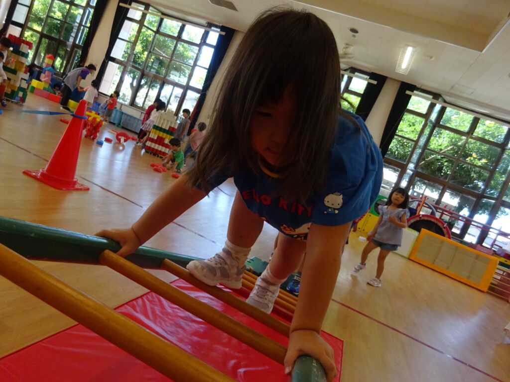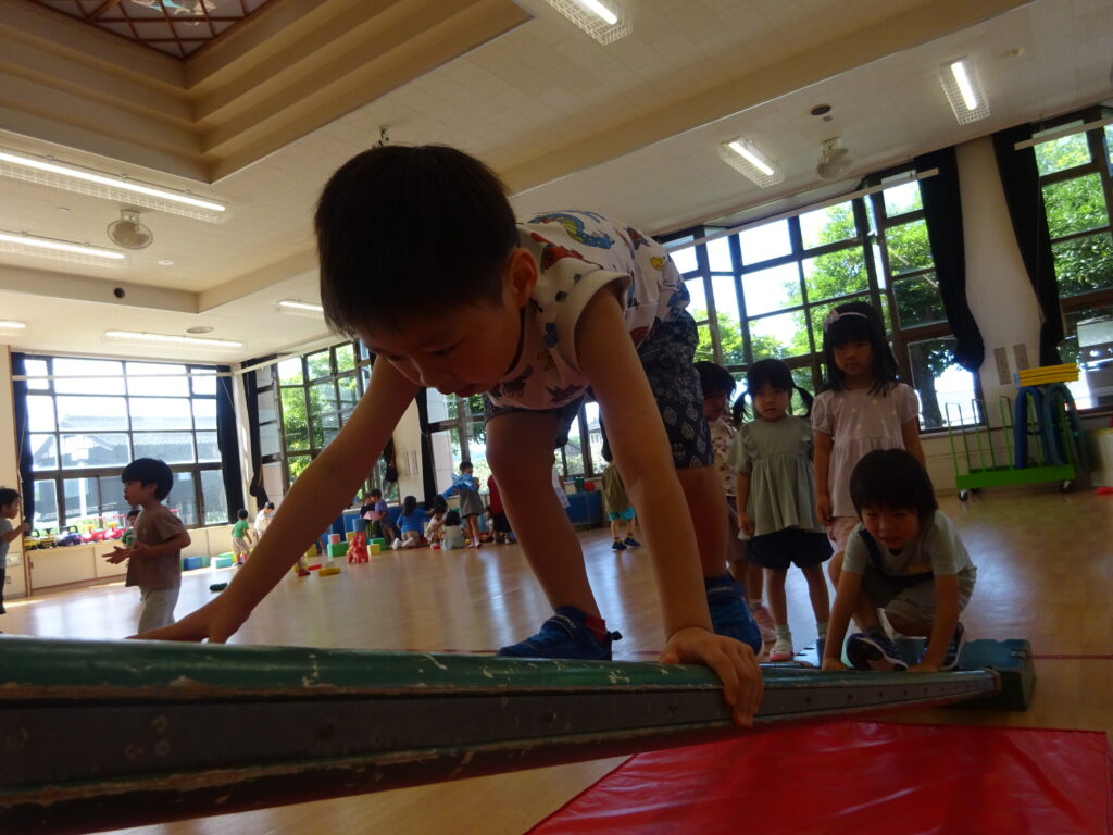 完成すると❝私が❞ ❝僕が❞とやる気満々!斜めに設置している為怖さからゆっくり進んでいく子ども、❝簡単、簡単❞と少しスピードアップして進んでいく子どもと様々な姿が見られました。また登り切った後はマットをめがけて思いっきりジャンプすることを楽しんでいました☺