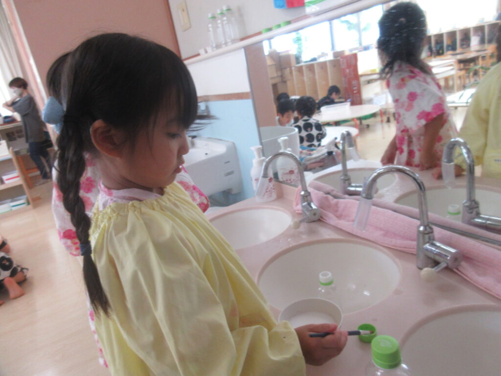 赤ちゃん人形に与えるためのミルク作りを一緒に行いました。ホールでの活動の前に「あとで一緒に作ろうね!」と保育者と子どもでお約束。白い絵の具を溶いて慎重にペットボトルへ・・・!