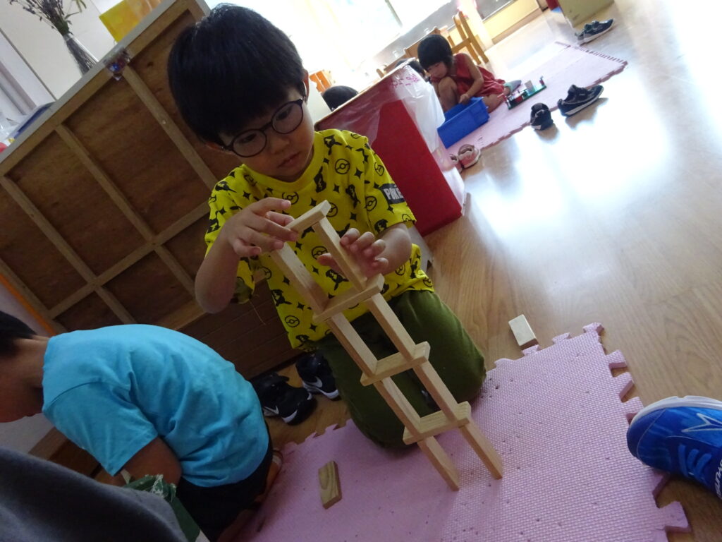 背が届かなくなると「先生、届かない…」と困る様子も見られましたが、用意した巧技台を交互に使いながら自分たちの背より高く積み上げ、飛び跳ねたりガッツポーズをしたりしながら大喜びしていました☺