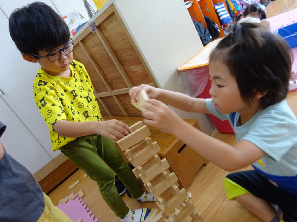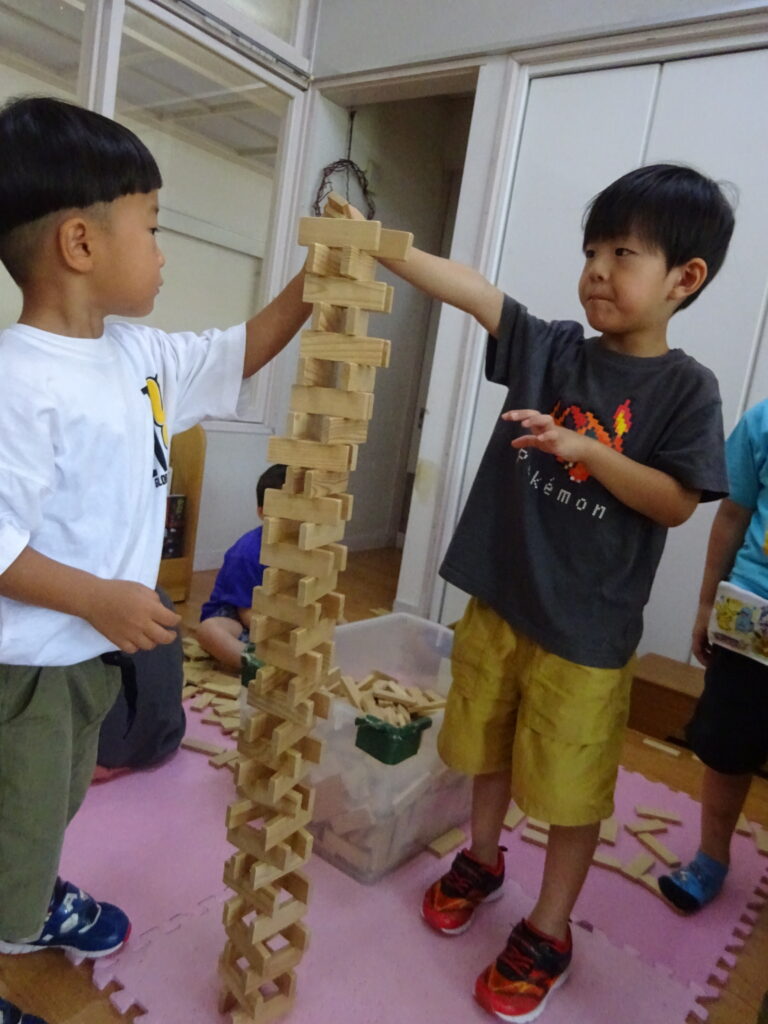 ある友だちが「みんなで力を合わせたら高くなるんじゃない?」と言うと大賛成!今度は友だち同士でチームを組み、どのチームが一番高く積めるのか競争していました。