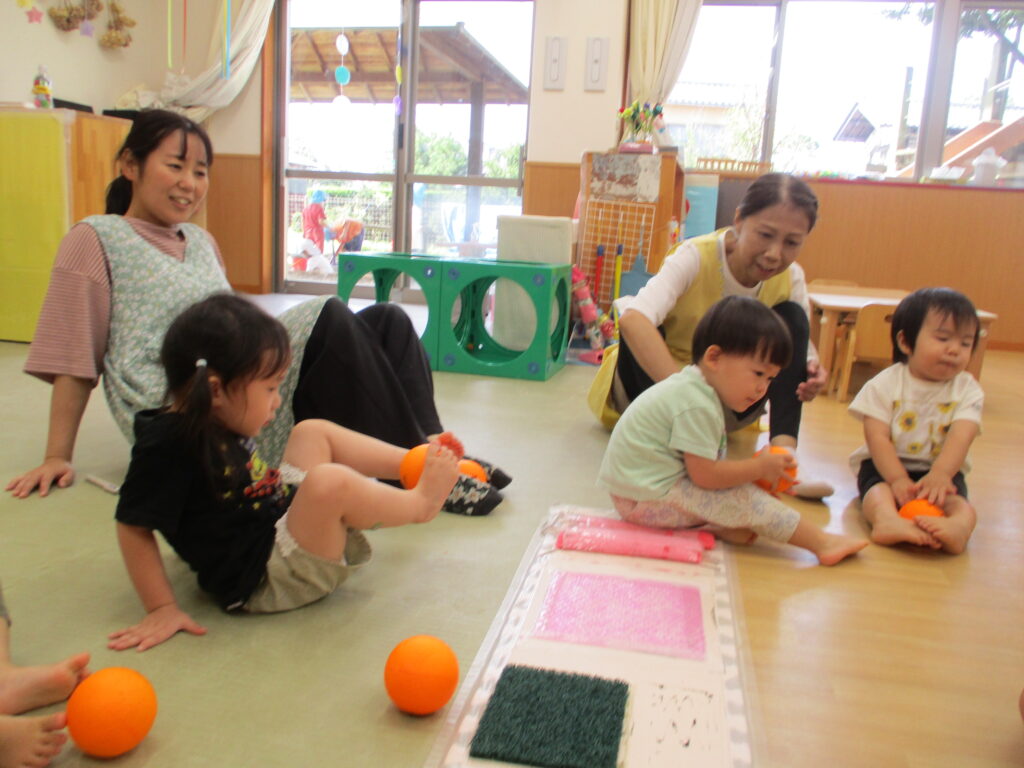 次は手をパーにしてを手のひらでコロコロ転がしていきます。真似っこが上手になってきた子どもたちは、少し難しいことも楽しく挑戦していきます。手の平から転がり落ちないようにコロコロ転がすことで力を調節する力が育ちます。