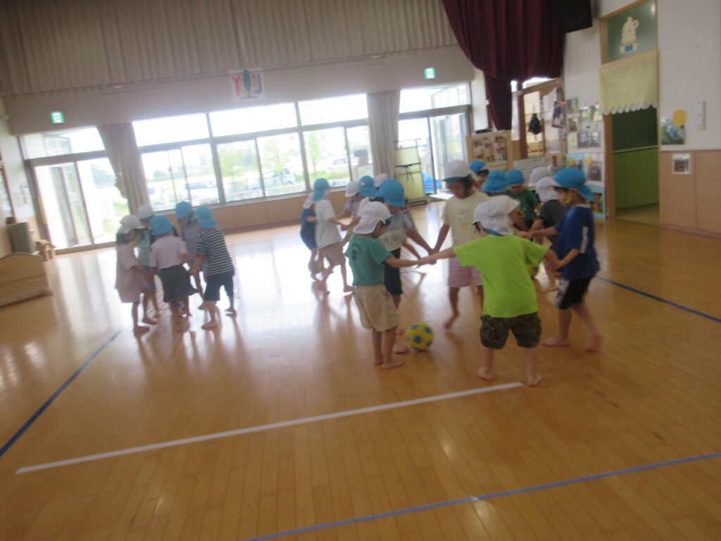 ボールが輪からでないようにゆっくり進みながらも着実に進むタイプや、とにかく蹴り合って前に進めば御の字タイプなど、その時のグループによって姿が変わります😁友だちの手を離さないように、周囲を見ながら、足でボールのタッチをする。難しいですが、友だち同士で喜びながら取り組む子どもたちです😋