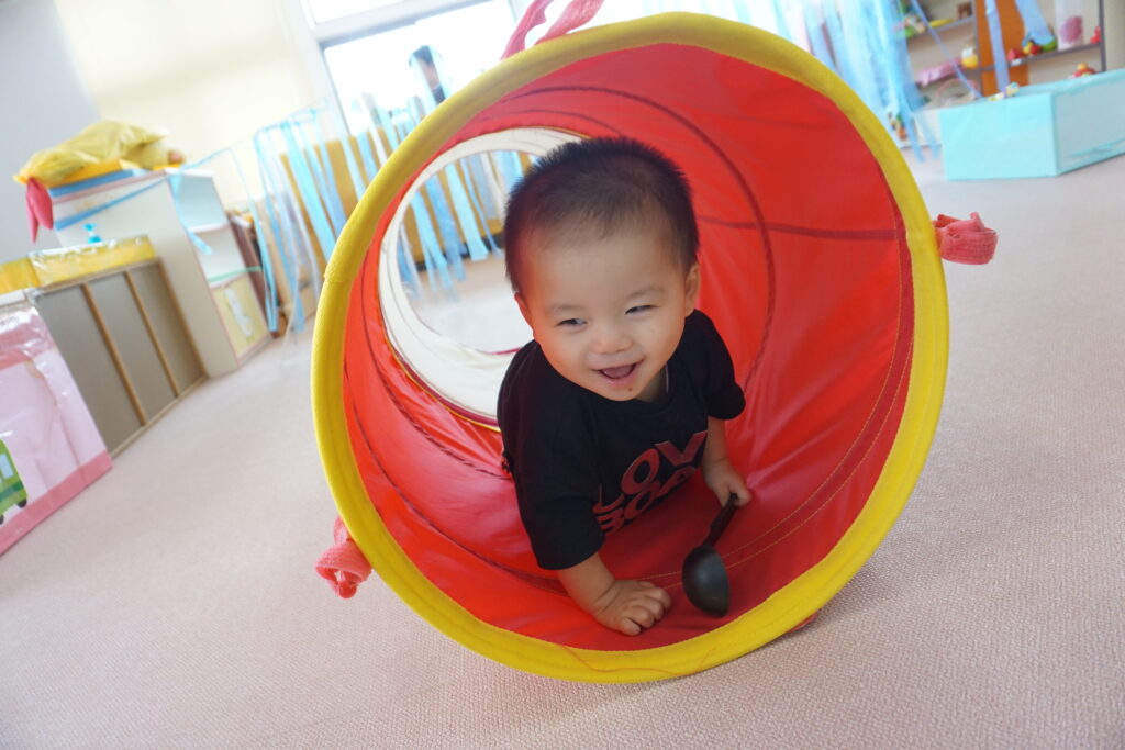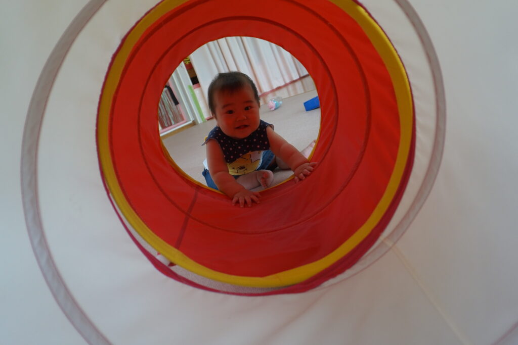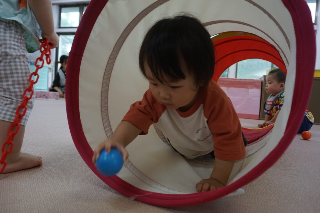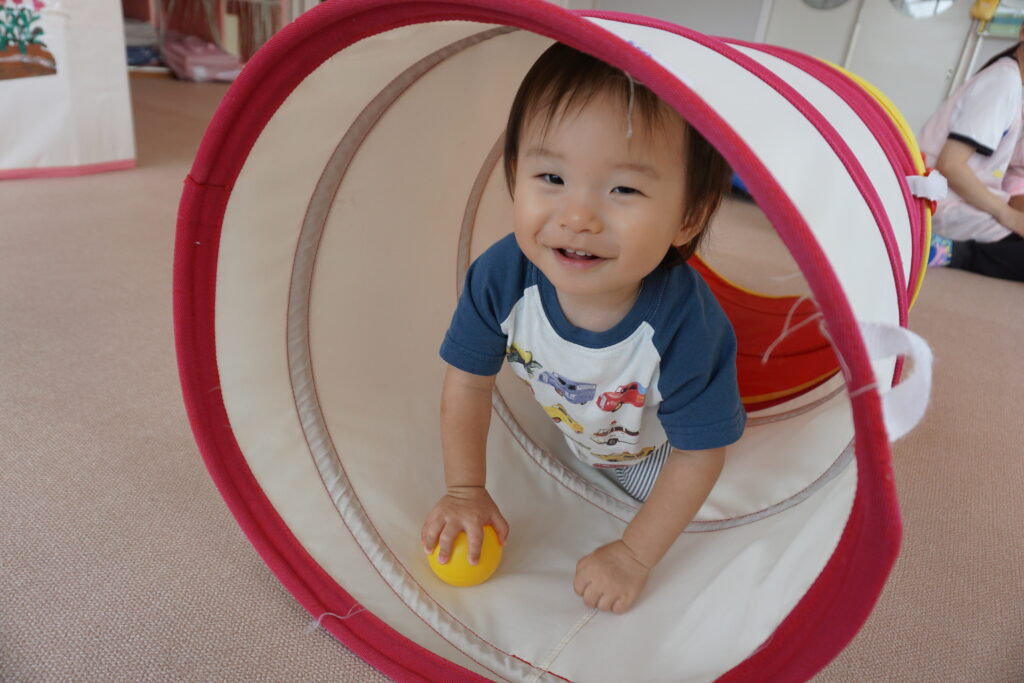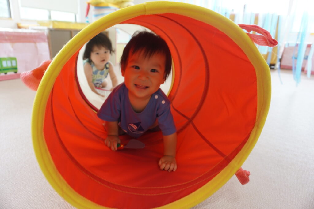 お友だちがいくと一緒に入って行ったり、反対側から覗いてみたりして、同じ遊びを楽しんでいます。