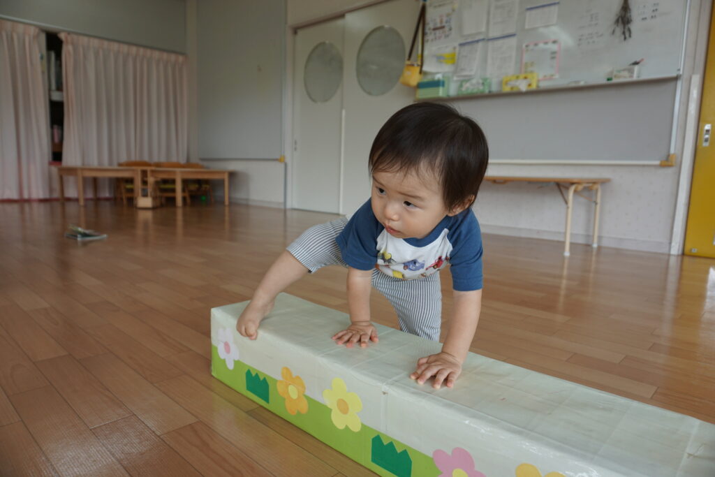 お部屋でも体を動かして遊べるように、マットやトンネル、手作りの台などを用意してあり、興味を示して遊ぶ子どもたち。