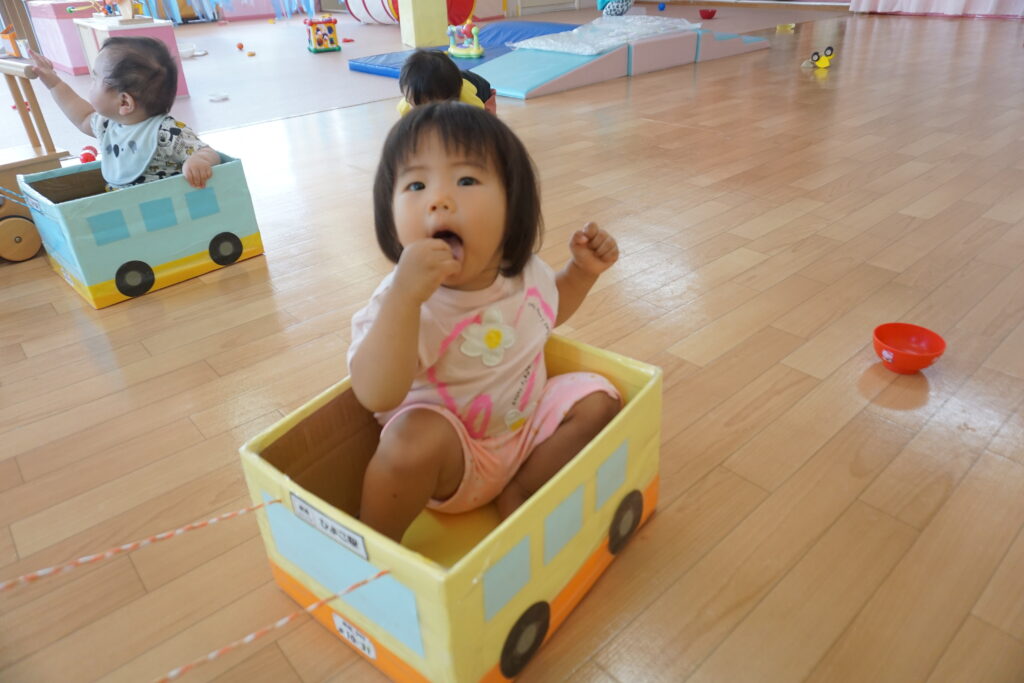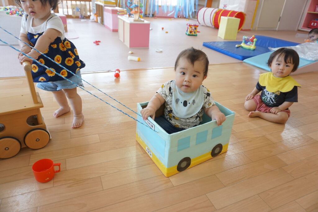 保育者に引っ張ってもらってのバスごっこ。“自分も乗りたい”と待っている姿が見られ驚いてしまいました。