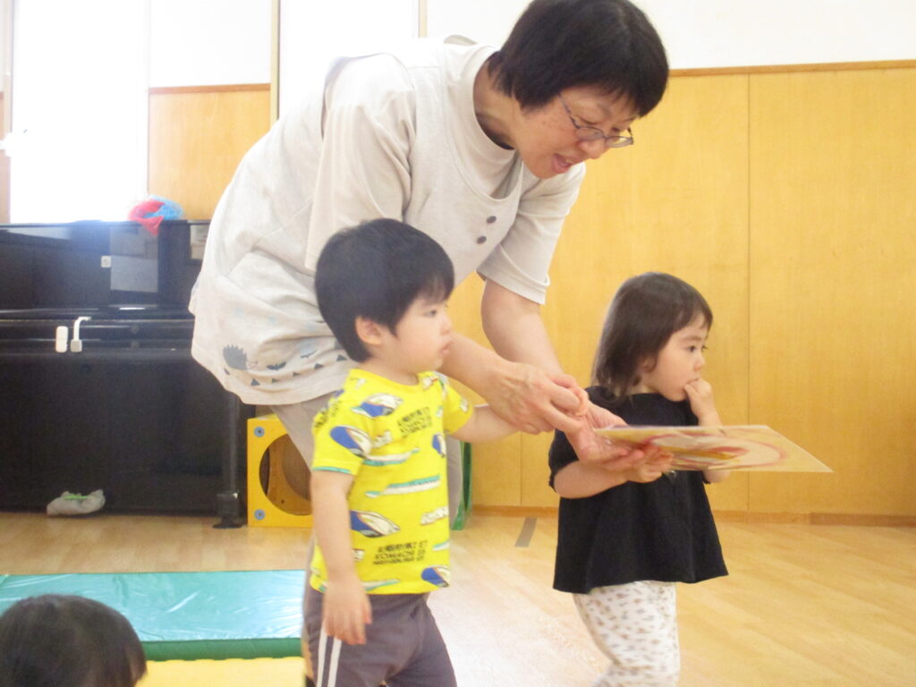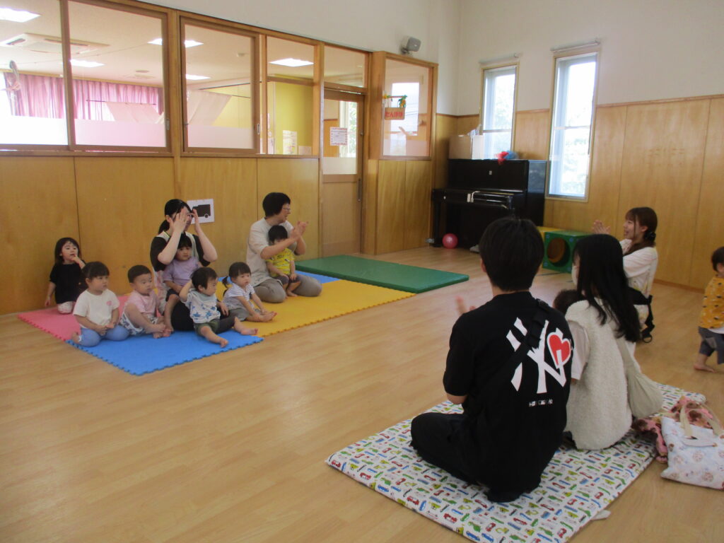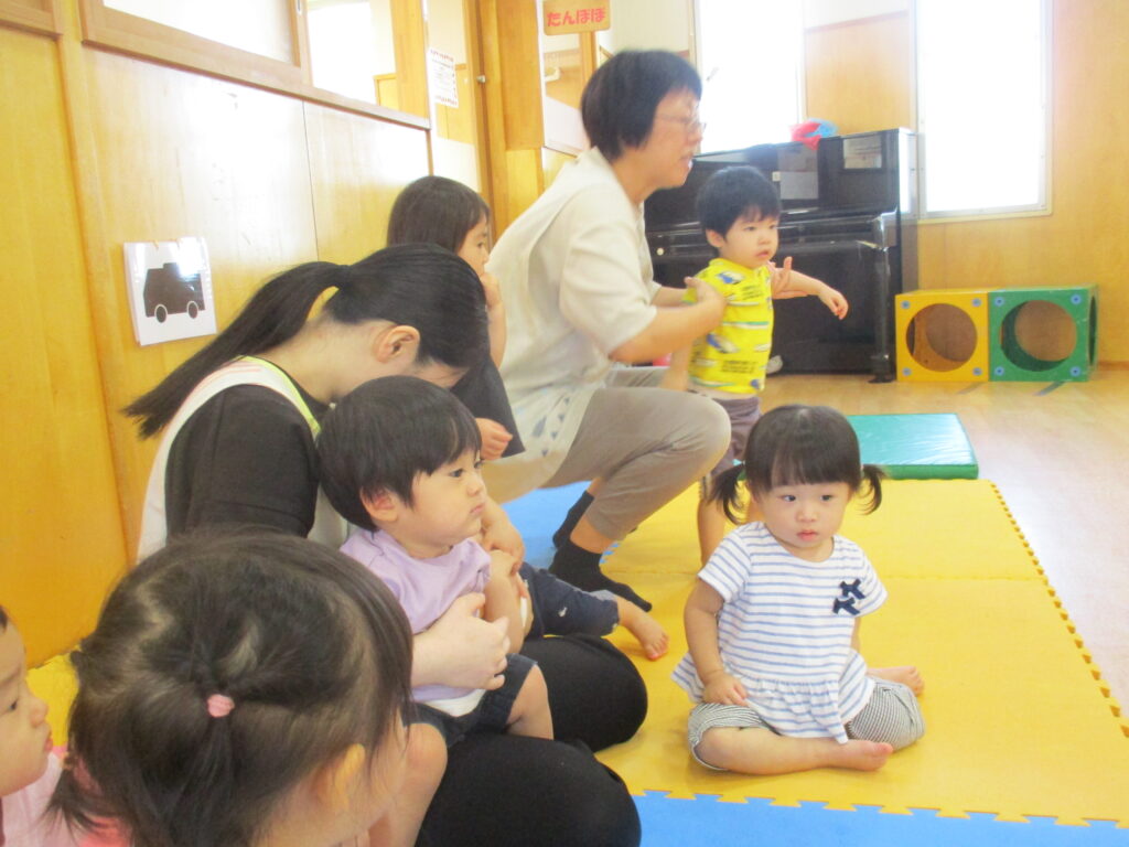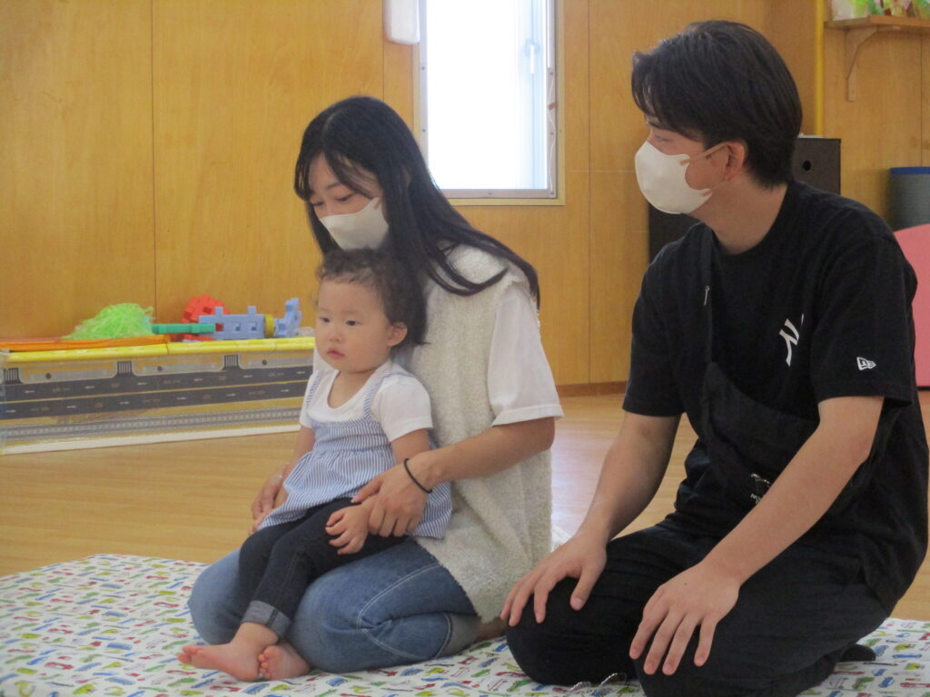 「好きな食べ物」「何歳になになりましたか?」と誕生児さんに質問をしてみたら上手に「2さーい!」と手で表してくれました。「好きな食べ物」の質問では照れてお母さんの膝の上に座ってお母さんにお話をしてもらいました。