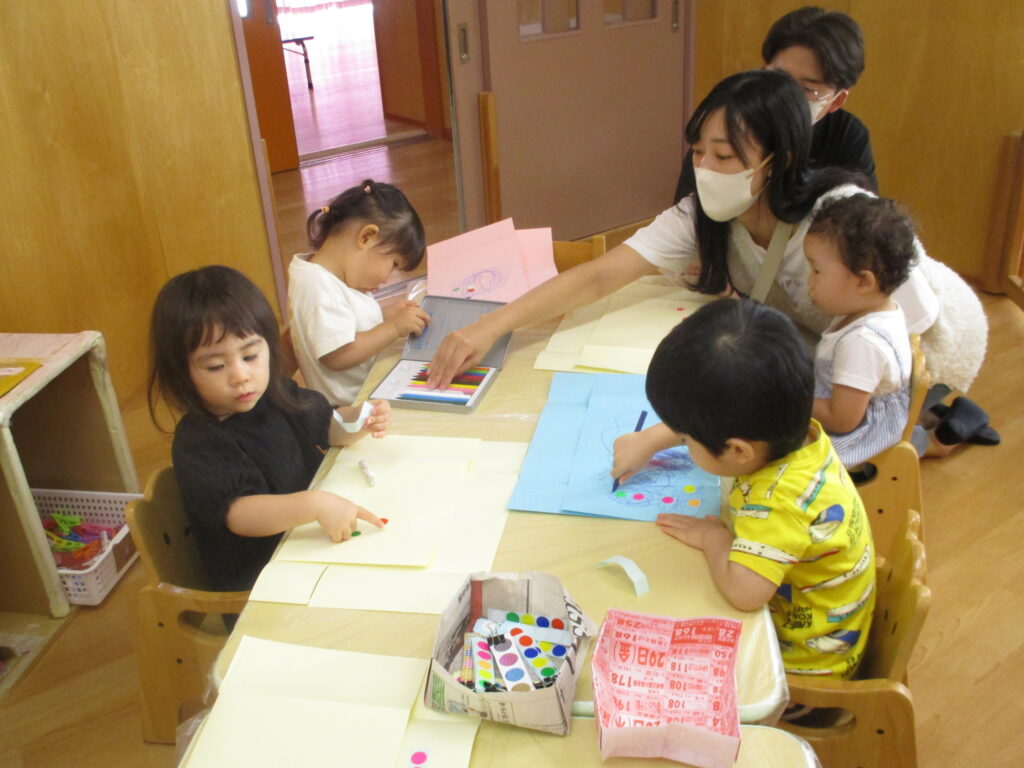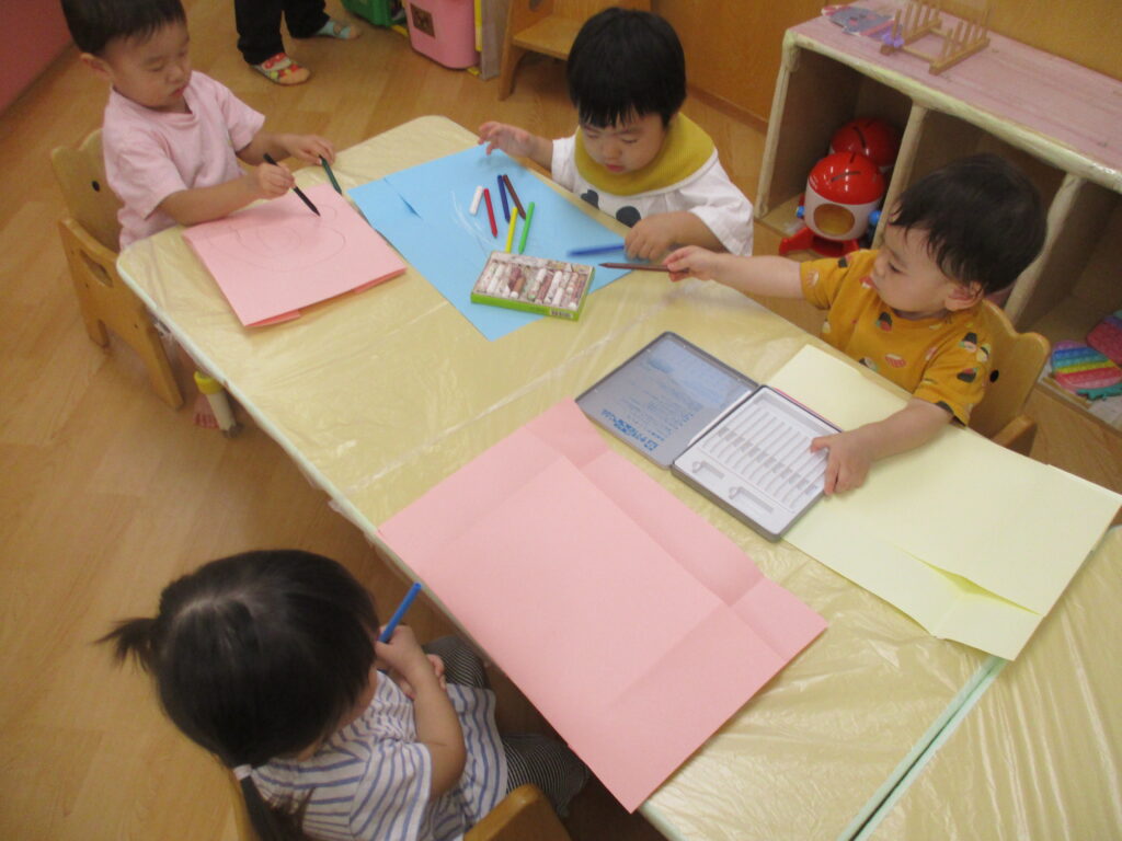 お次は~お部屋に移動して、画用紙でカバンを作る前に、自由にお絵描きをしたり好きなシールを貼ったりして楽しく飾りつけをしていました。 完成したカバンがどんなふうになるか、みんなワクワクしている様子でしたよ✨