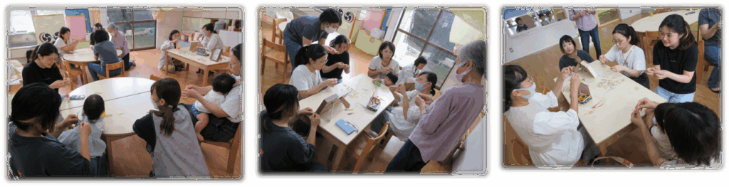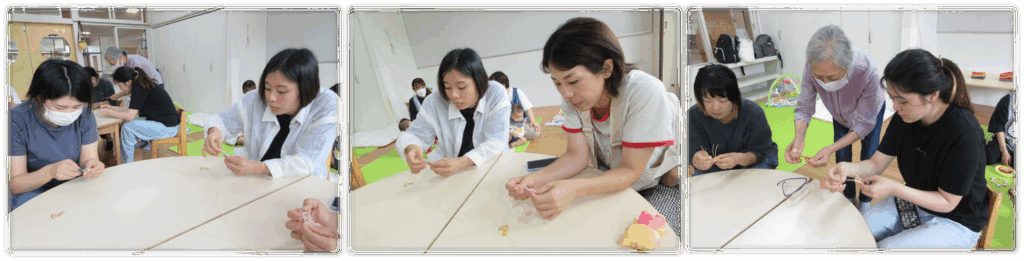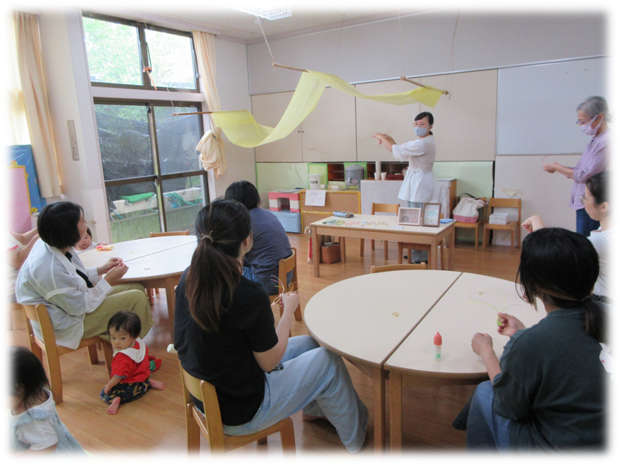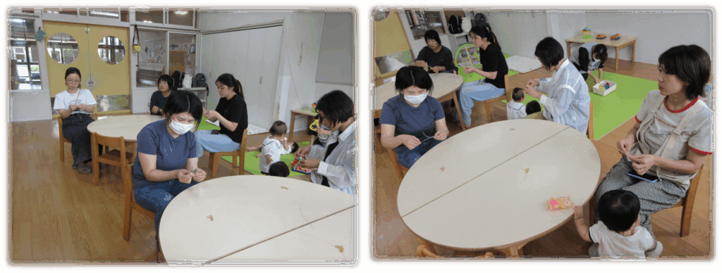 お母さん同士教え合いながら「ここを引っ張って~」「そうです!上手ですね」とやり取りも見られました。