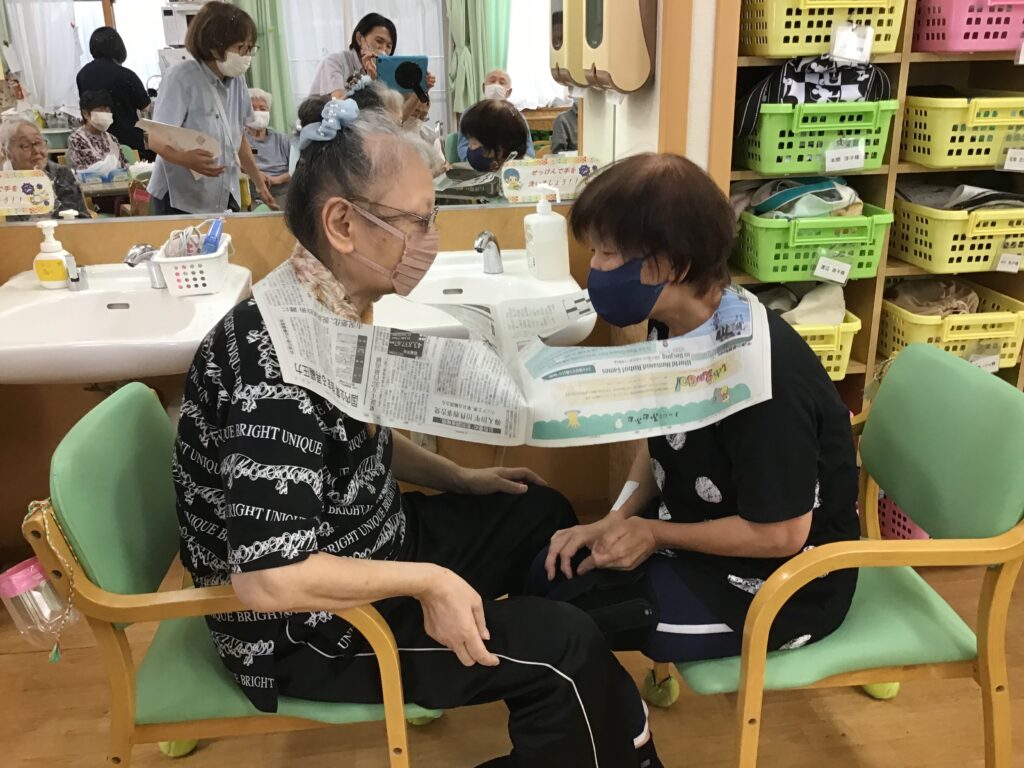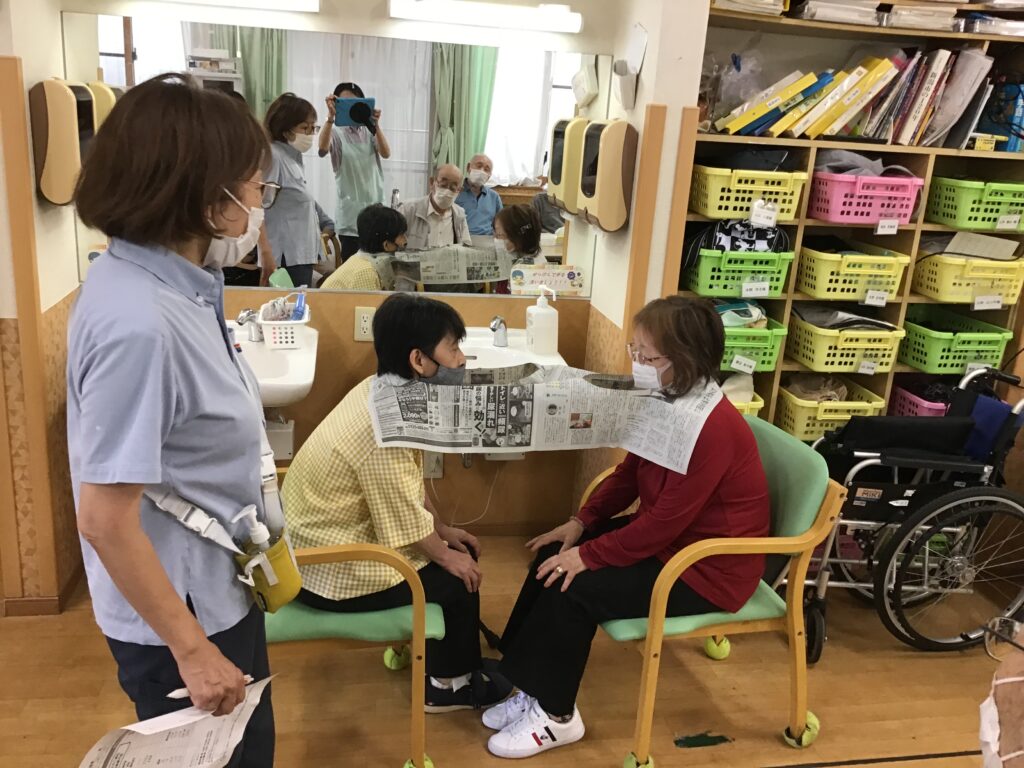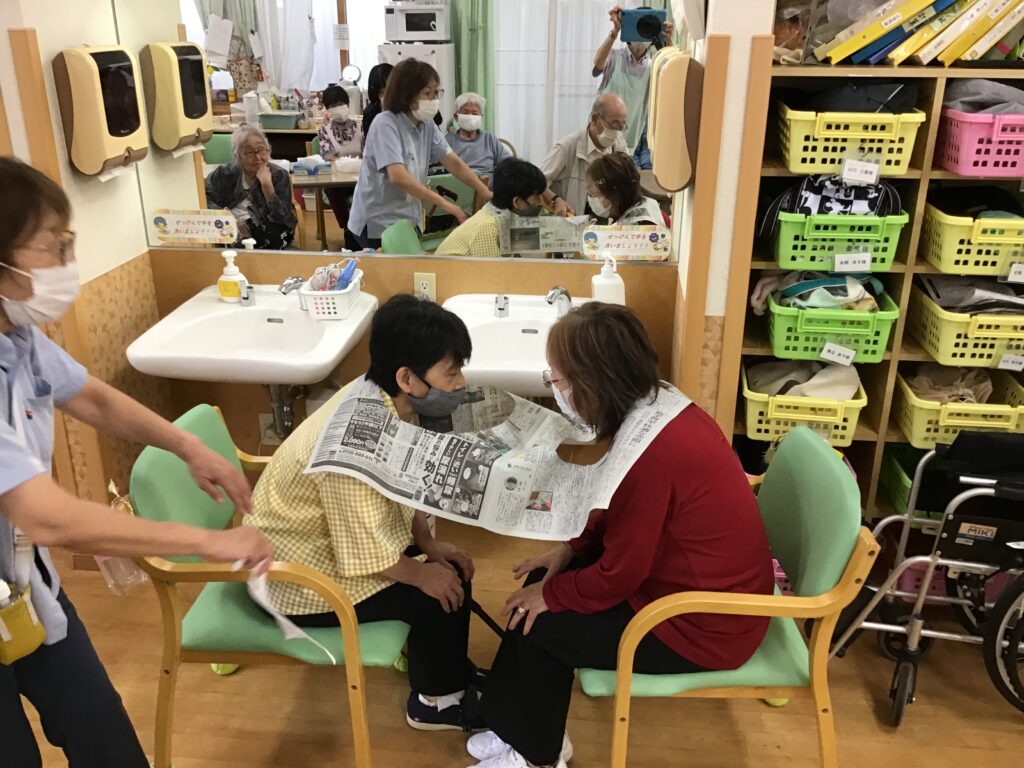 9月12日 金曜日 ネック相撲を開催致しました。ネック相撲とは新聞紙の真ん中を切り向いて見合って!見合って! 先に新聞紙が破けた方が勝ちです。対戦の後は シャトレーゼのみたらし団子取り寄せして甘い物を食べました 「美味しかった」(*^-^*)