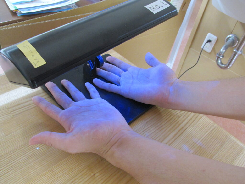 正しく手洗いできているか、専用ローションをつけてから手洗いをして、洗い残しがないかをチェックする研修です。