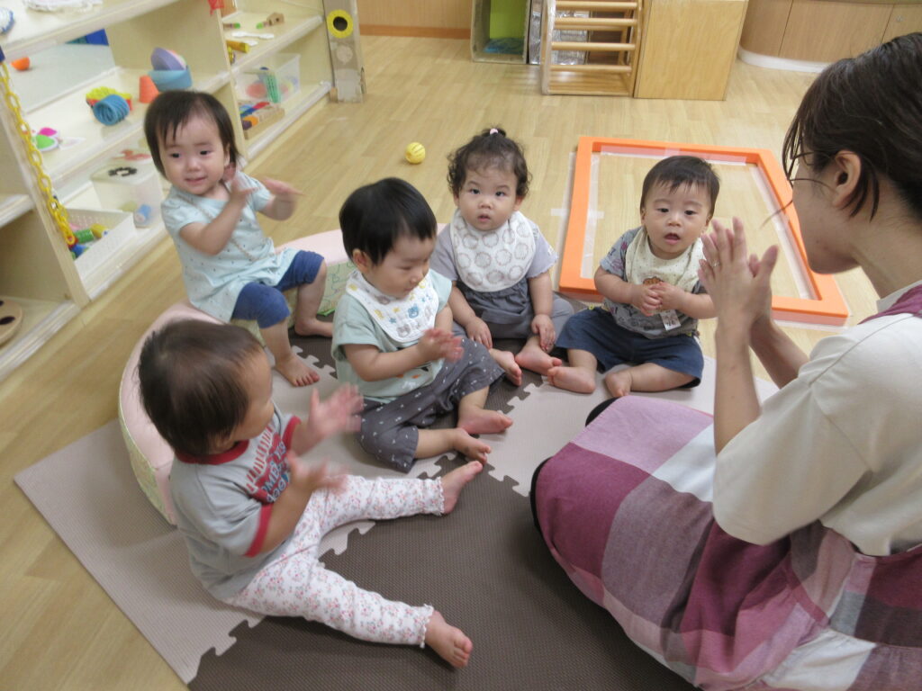 げんきっずや遊びの中で楽しんできたためか、パチパチと手を叩いたり、指を出してみたりと、一緒に楽しむ姿が見られるようになってきました!