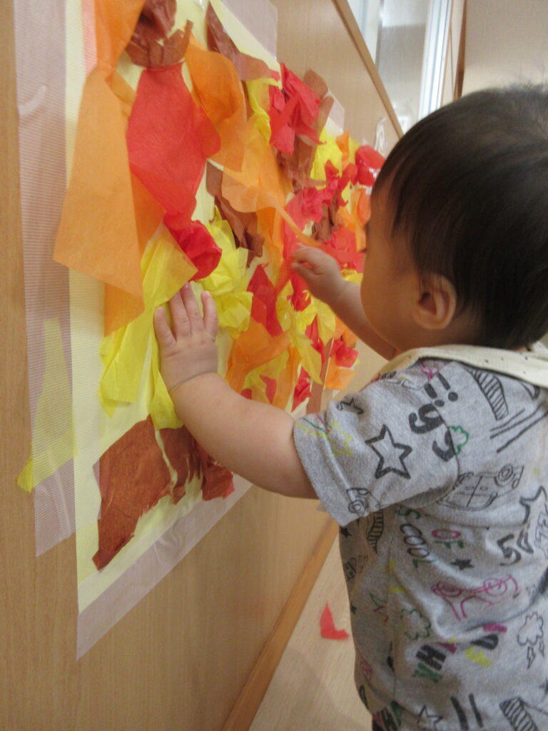 テープをはがしたり、小さなものを指先でつまんだりするのがブームのお誕生月のお友だちのために、いろんな種類のつまむ・ちぎるコーナーを用意しました。