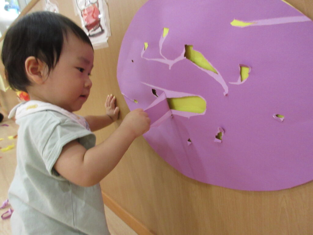 びりっという音や感覚、紙をポイポイ…いたずらが遊びになりますね。