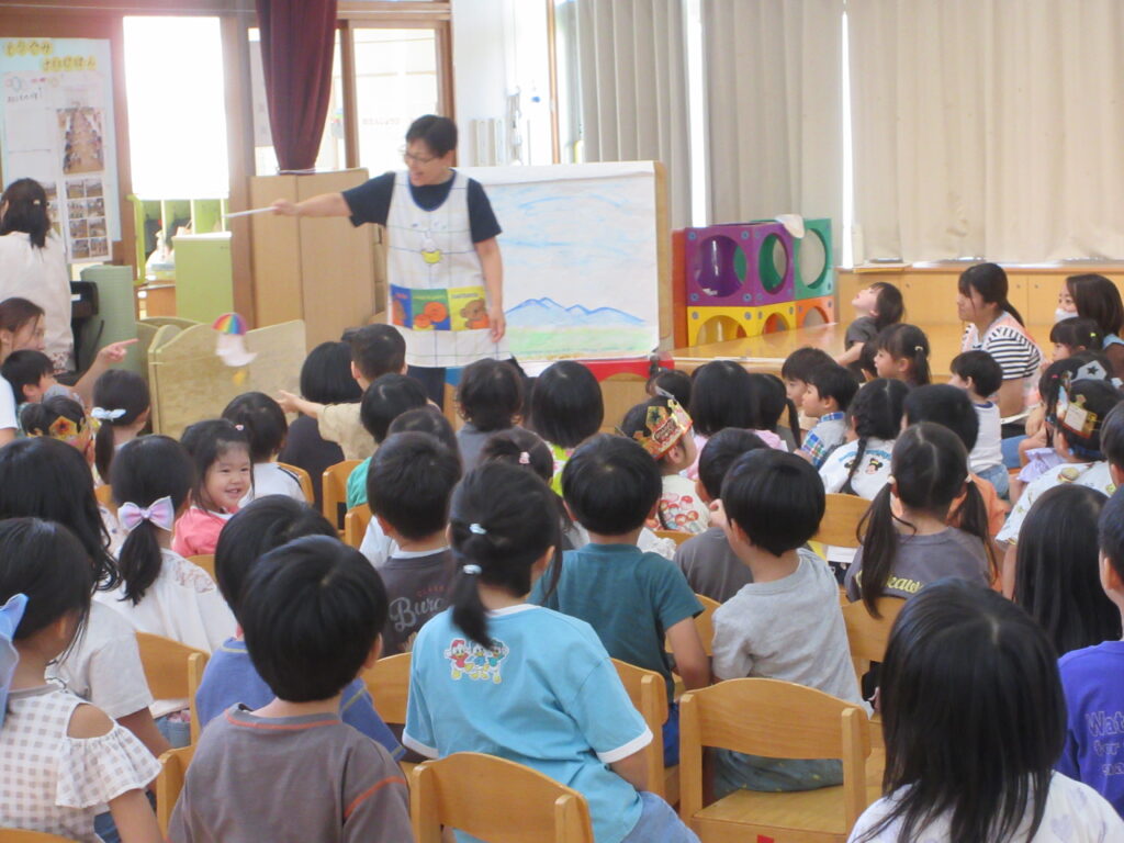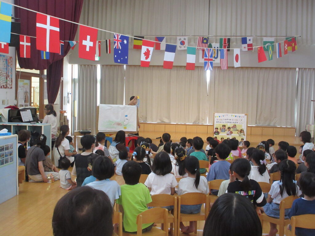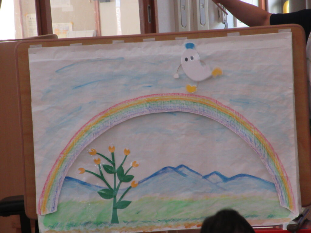 実は背景のイラストも保育者の手描きなんですよ🌟毎月の職員の出し物では子どもたちの笑顔のために先生方が準備を進めてくれていたのだと思うと心が温まりますね😊