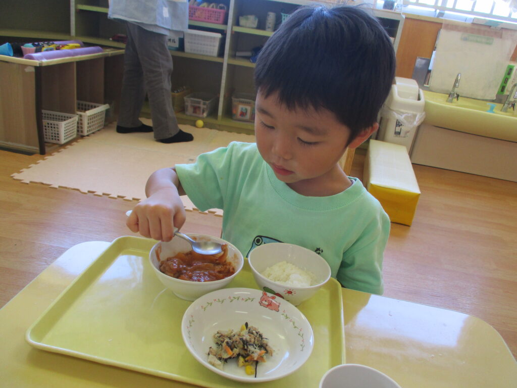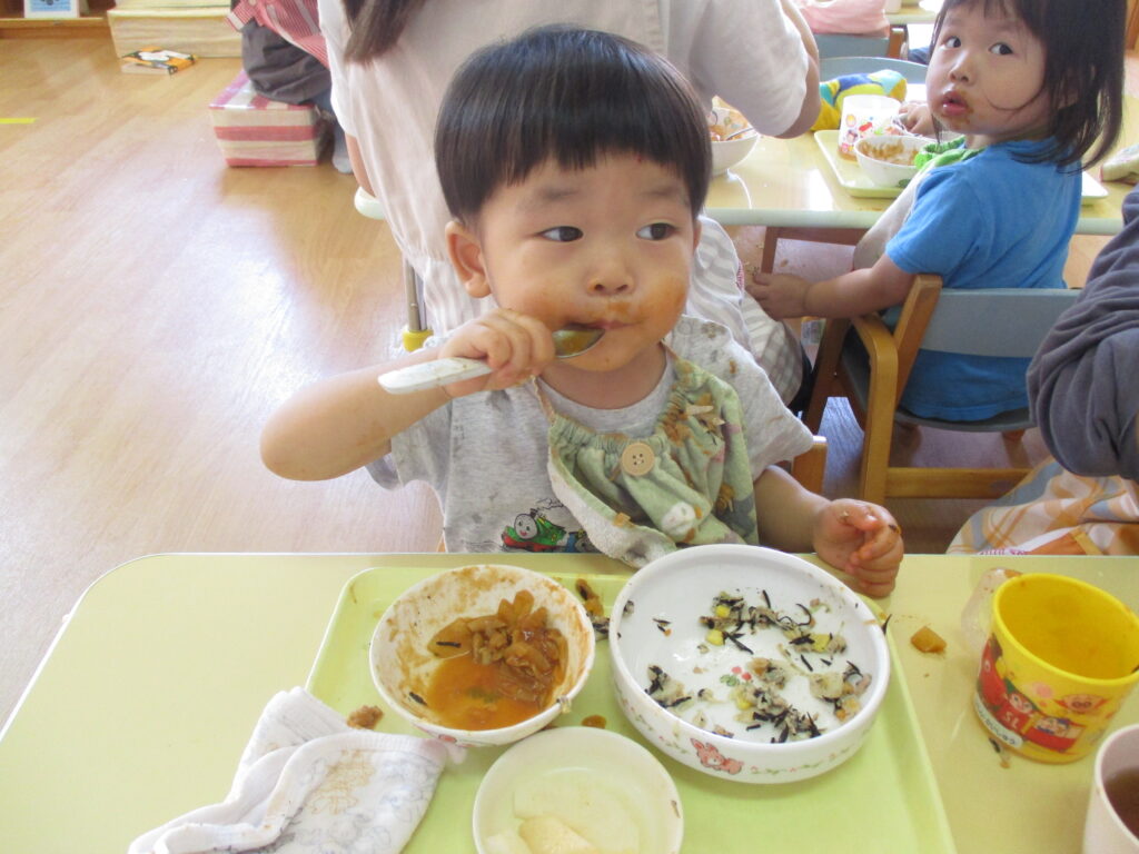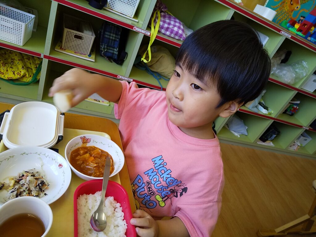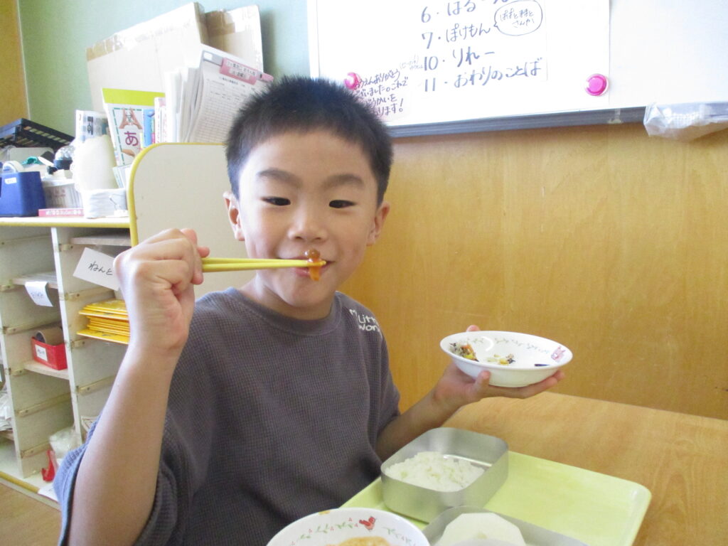 給食のポークストロガノフには、「しめじ」と「まいたけ」が入っていました。夢中になってきのこを探す姿がとても可愛く、また、見つけた瞬間の嬉しさがこちらまで伝わってきました。