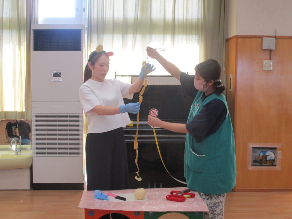 梨をスルスルと職員が皮を剥いてみるとこんなに長くなり・・・