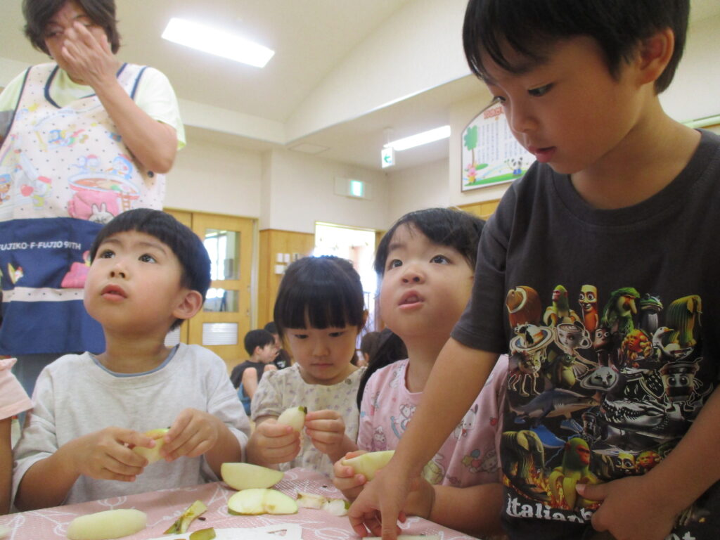 続きまして・・・「りんごと梨」のお話です。旬な果物でよく給食に出てくるりんごと梨。しかし、子どもたちの中で切り方が一緒のため、「これは梨?」「これはりんご?」と梨とりんごの違いに気づけたらなと思い、今回はりんごと梨を比べてみました!