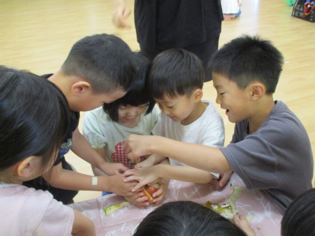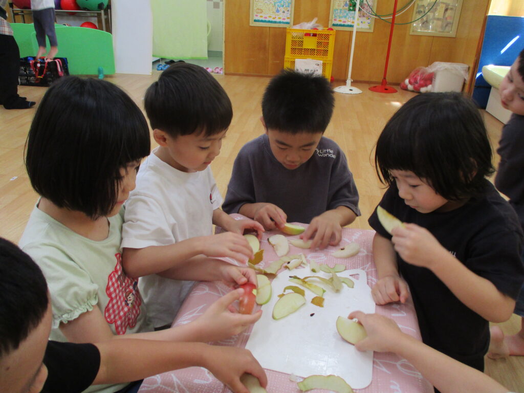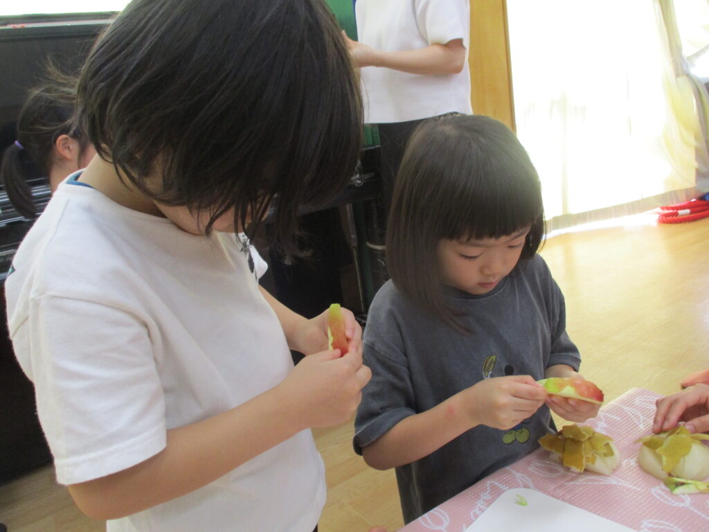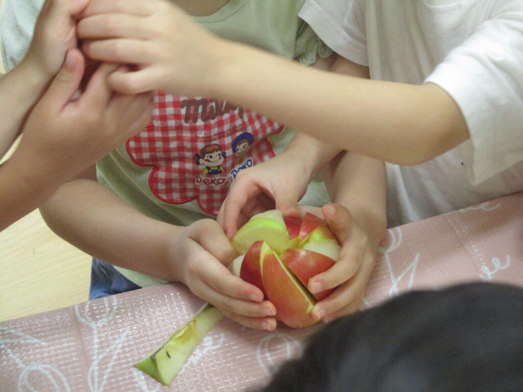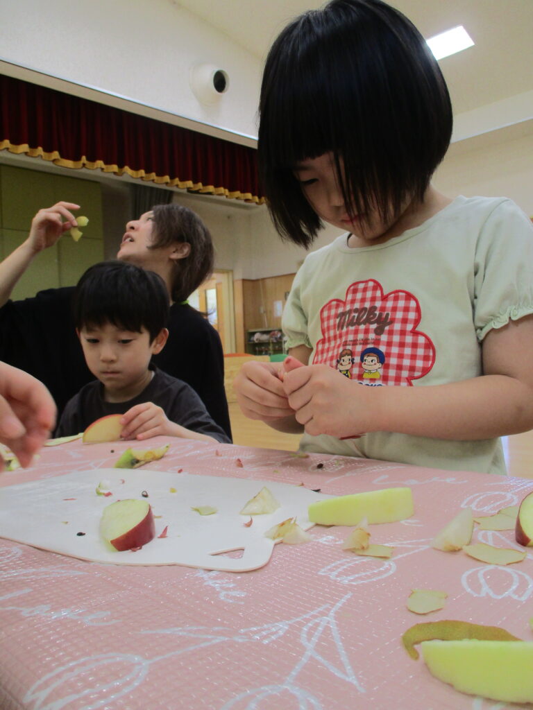 5歳児のめろんさんの時では、カットされたりんごと梨を集めてパズルのように組み合わせ始めました!「種も入れよう!」「へたもつけよう!」と話しながら作っていましたよ😲
